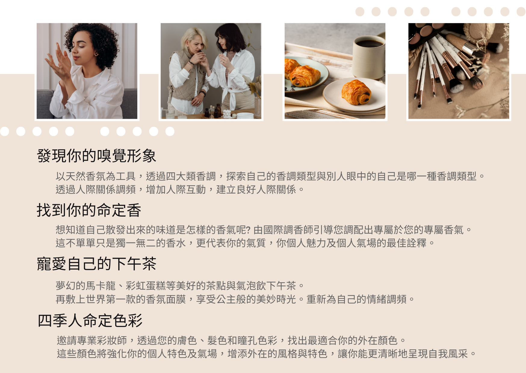 本堂課特別邀請嗅覺形象管理顧問創始人陳美菁Kristin Chen,一起在課程中透過四型人格客製化調香、四季人格命定色彩,發現自己的嗅覺形象,並且進行優化與塑造。幫助您打造自己專屬獨一無二的魅力,為您的人際關係、職場關係、情感關係大大加分唷!