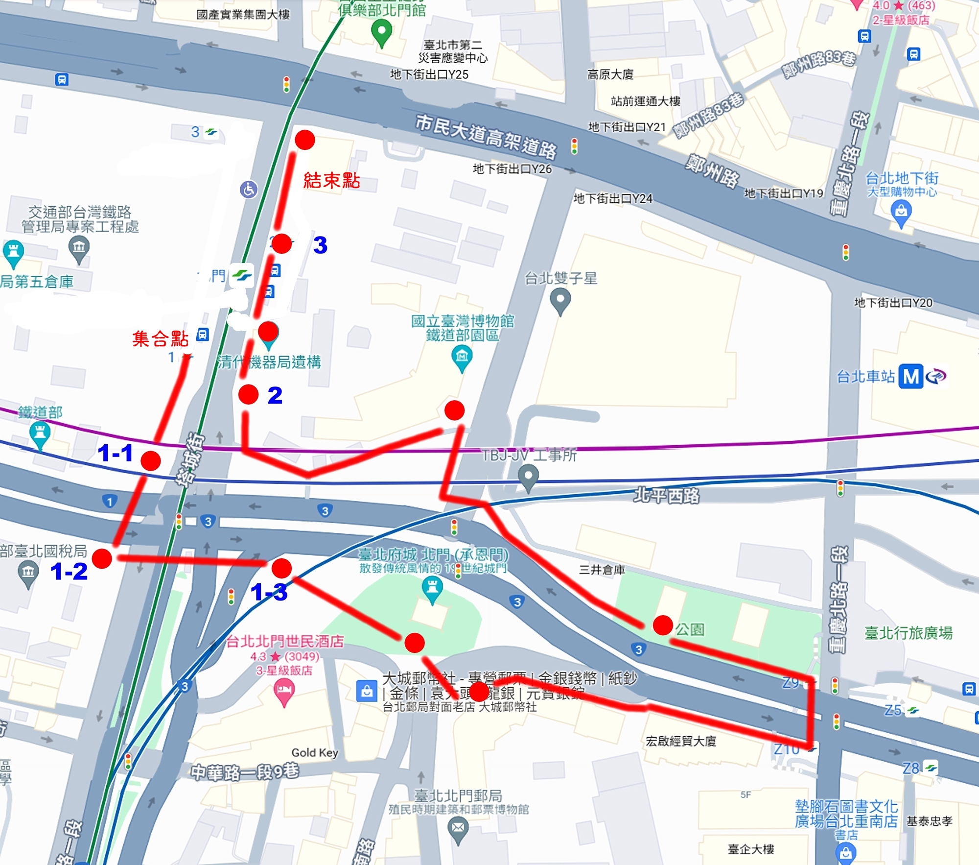 集合點 北門捷運站1號出口→ 機器局解說牌 / 【脈動】1-1 → 【脈動】1-2 → 北門廣場/【脈動】1-3 → 台北郵局 → 7-【來跳一支花飛花舞吧】→ 三井倉庫 → 鐵道部園區 → 舊機器局移構/ 2-【遺跡之音】 → 3-【鑄器賦形】 → 捷運站二號出口 / 台北工場(解散)