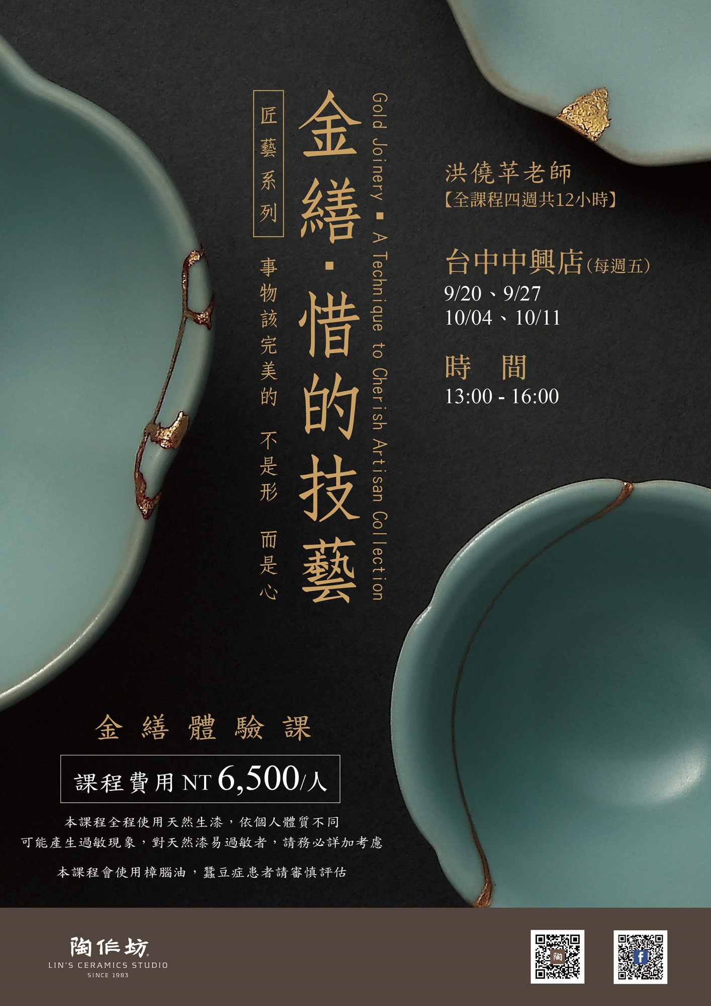 ෆ課程材料為天然生漆與純金粉,均適合於食器修繕,修復完成後的食器堅固、美觀,能持續安心使用。