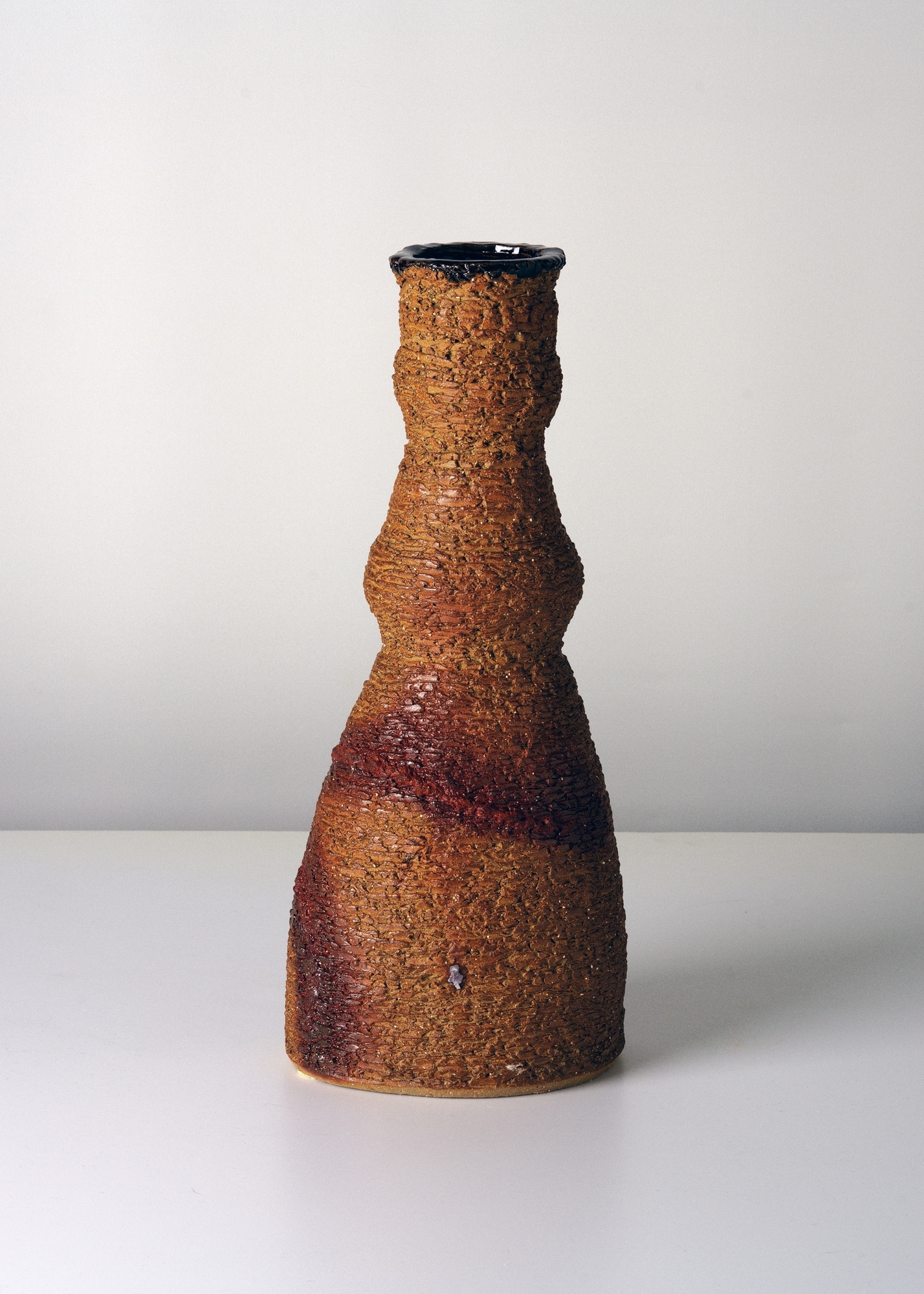 喜愛大自然的邱永豐,以大地為師,時刻觀察地質及岩表,透過重新發掘中國山水畫的符碼—皴,結合個人內在風景與多 年的實驗與改良成果,創作「行山之永皴 燒」系列。《永皴瓶1》、《永皴瓶12》, 以有機線條再造傳統陶瓶的可能性,呈現 出不同的表現形式;作品《山行》、《烏山行》堆疊變化多端的層巒山景,開啟與大地間的連結,反映出他的內在風景。