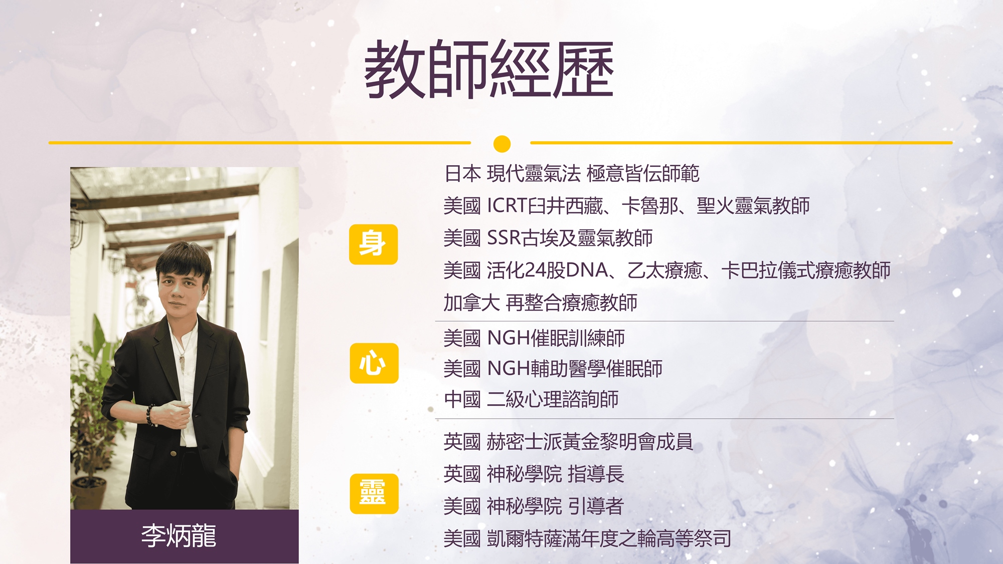 在身心靈三個領域已分別取得官方授權中文翻譯的講師兼任譯者,極少數能從科學角度切入身心靈三領域進行授課的講師,並以底層邏輯進行拆解教學,讓你真正學會身心靈。