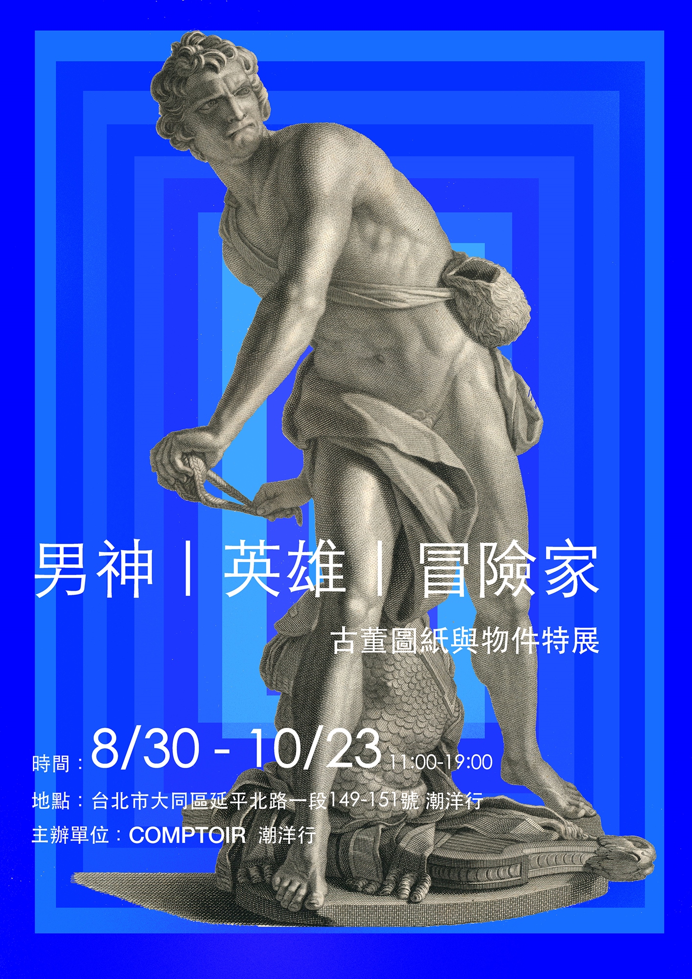 這次的展品以古董圖紙、版畫、物件為主軸,主題圍繞著男神、英雄、冒險家,包含十七、十八世紀的印有希臘神祇的版畫圖紙、古地圖、古星空圖、船隻設計圖、古董星座圖、1970s到90s的漫威漫畫,以及古董照相機、望遠鏡、指南針等等,希望您會喜歡。