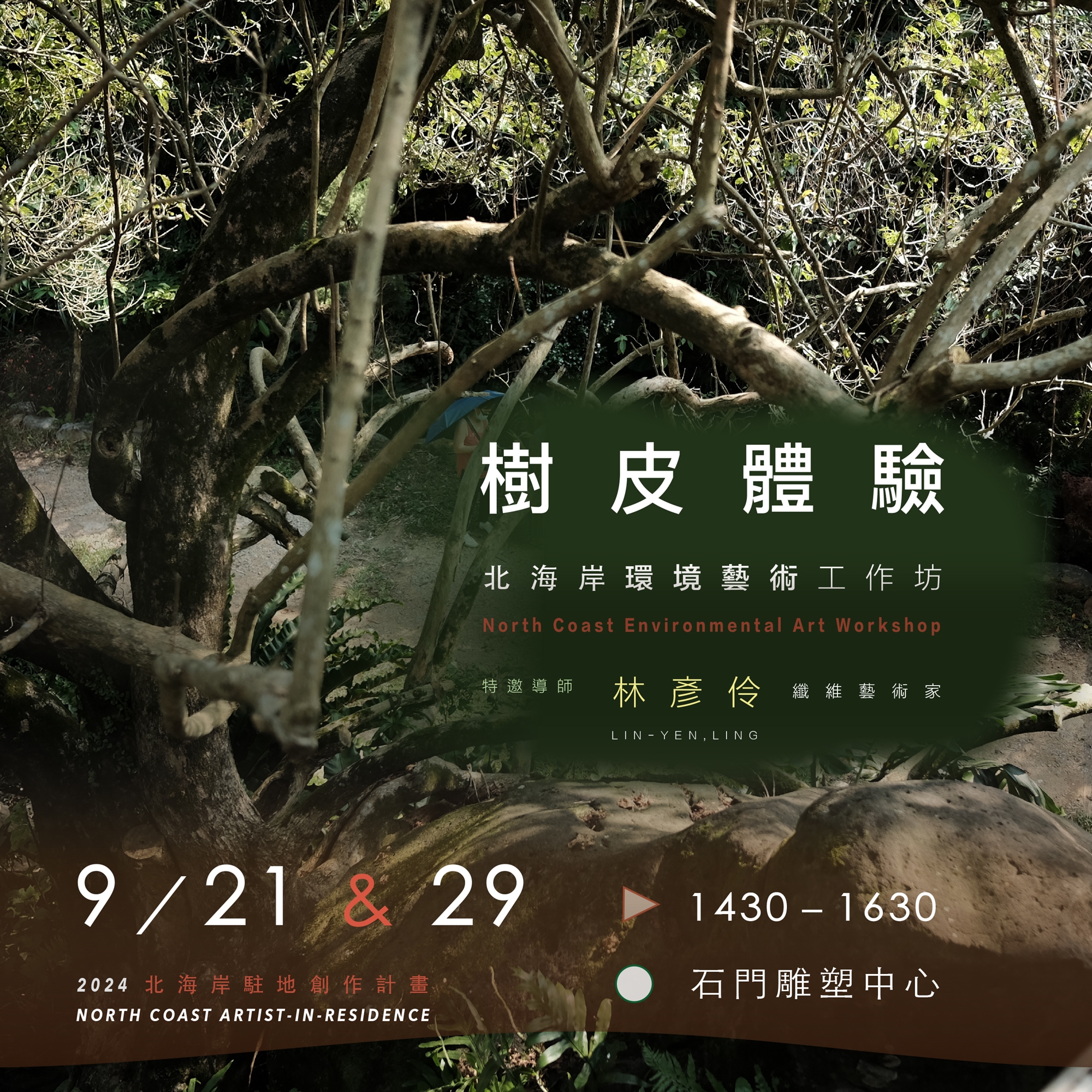 ※樹皮工作坊為與藝術家共創藝術作品,活動完成品留於活動現場,十一月將成為藝術家此次駐地創作品的一部分,並於成果展開幕後在石門雕塑中心展呈,歡迎一同共襄盛舉,報名即同意此活動共創內容。