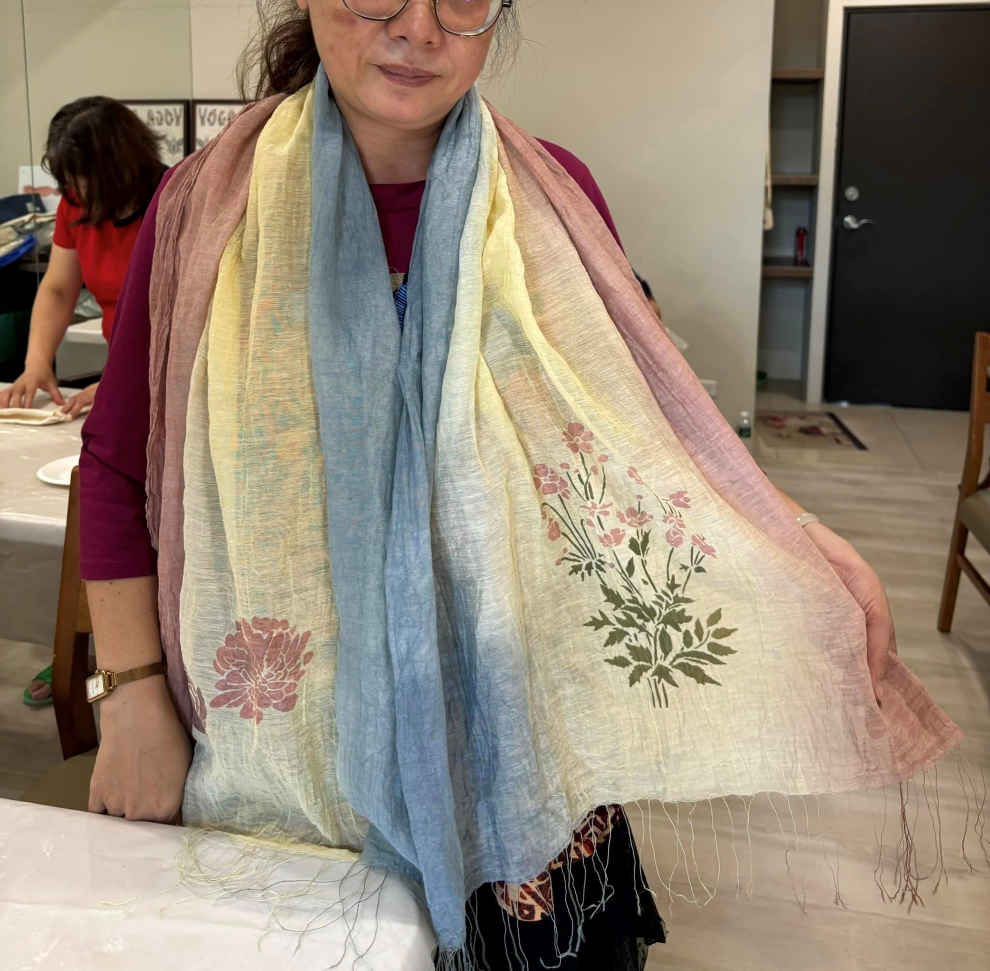 4.礦泥染門簾實際操作與指導:完成型染後,可選擇是否要單一顏色部分浸染。