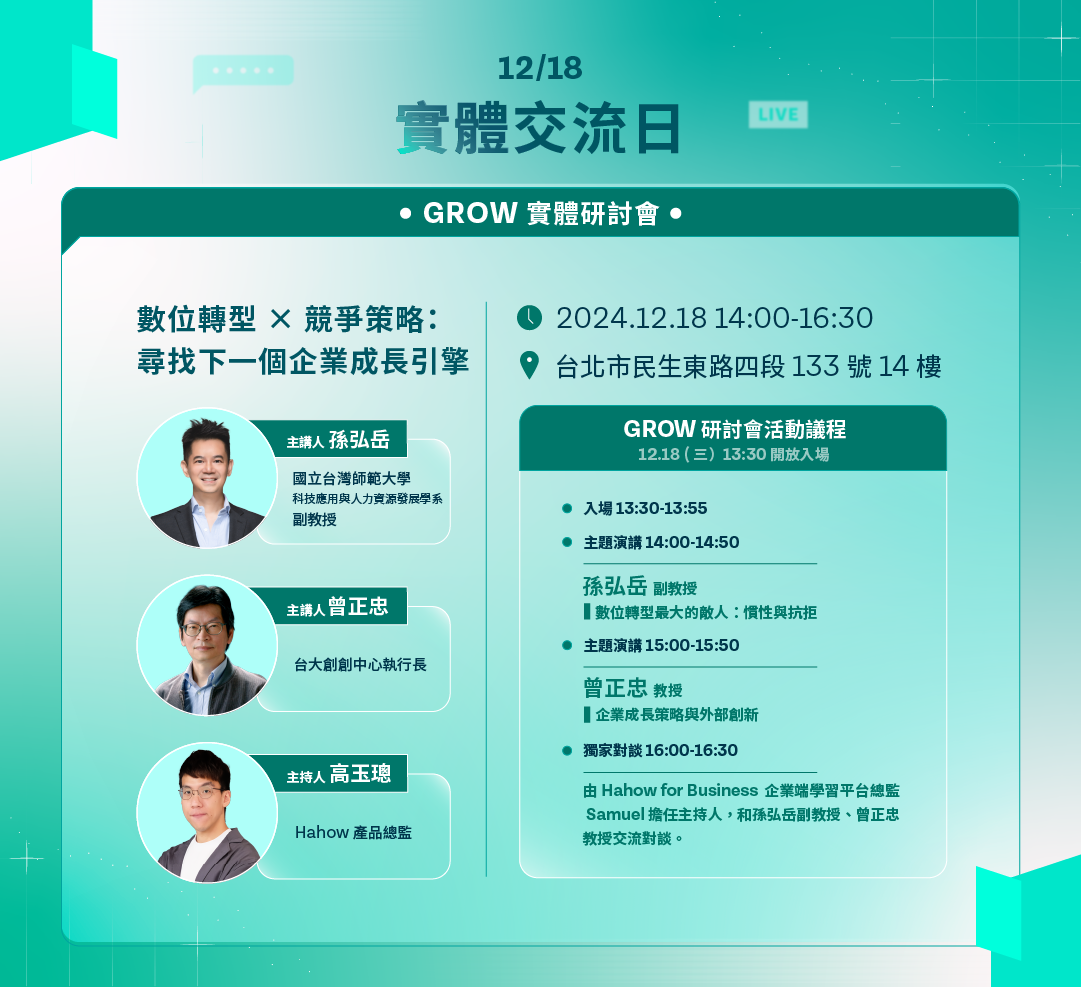 - 主持人:Hahow for Business 企業端學習平台總監 Samuel 擔任主持人