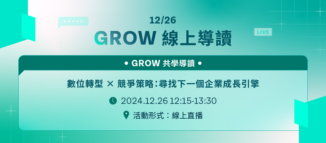 - 12 月 26 日星期四 12:15-13:30|線上直播導讀:企業轉型執行計畫與策略 / 張智鈞