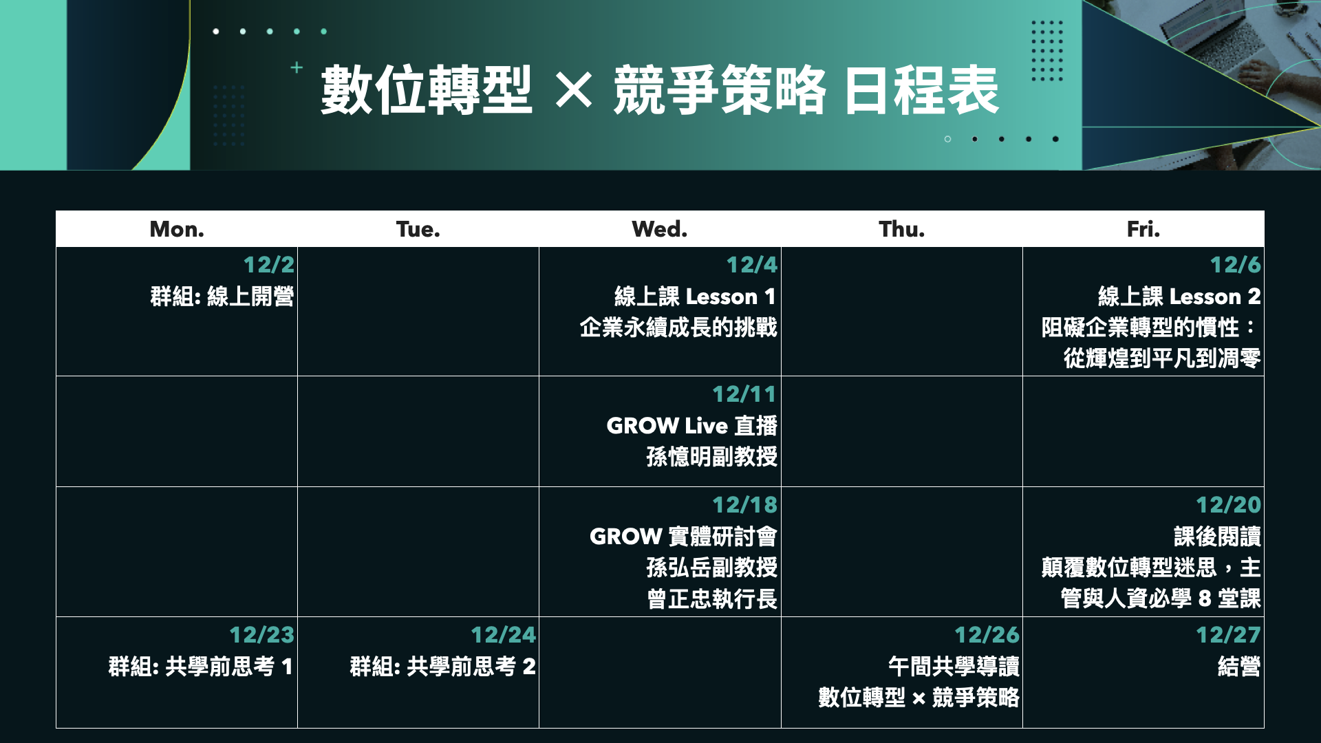 本次活動採混成學習方式進行,參與的各位將透過 Lesson 1- 2 和課後閱讀的自學、群組內的討論和思考,結合線上直播以及實體研討會,一起探討與掌握「數位轉型 × 競爭策略:尋找下一個企業成長引擎」。