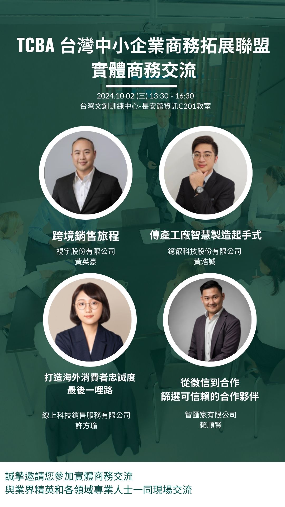TCBA台灣中小企業商務拓展聯盟 誠摯邀請您參加實體商務交流,可以與業界精英和各領域專業人士一同現場交流。