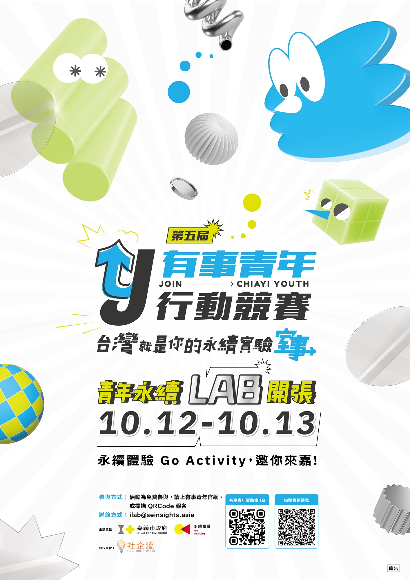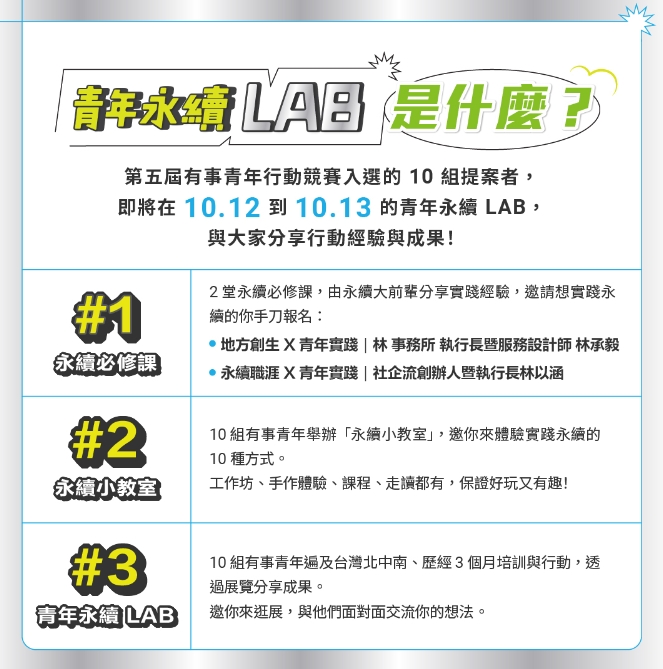 青年永續體驗關乎生活事、工作事、創業事,更是你我的事!青年永續 LAB 匯集了永續小知識,以及第五屆有事青年行動競賽的獲選團隊的行動成果,本屆還設有永續必修課及永續小教室。