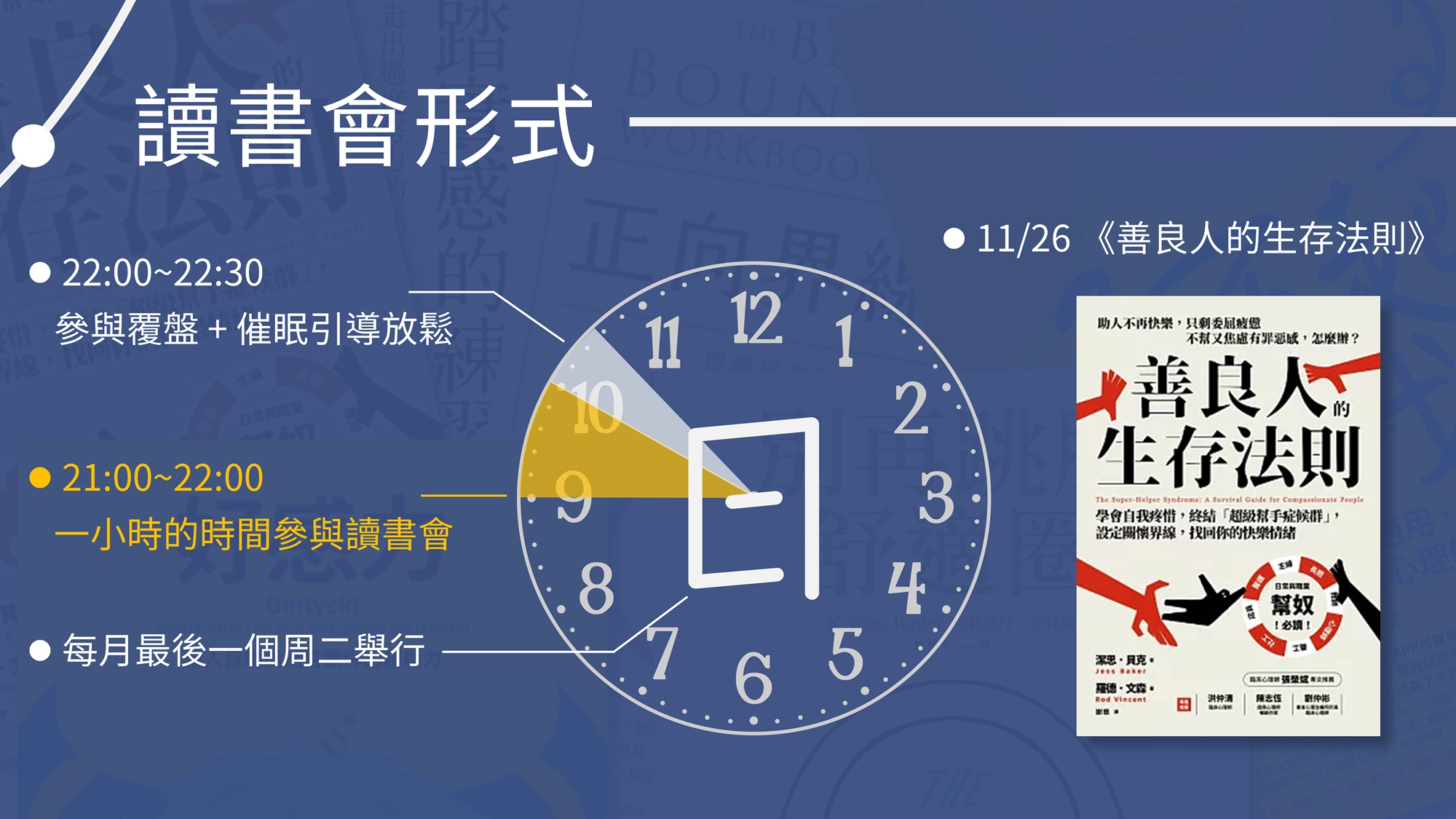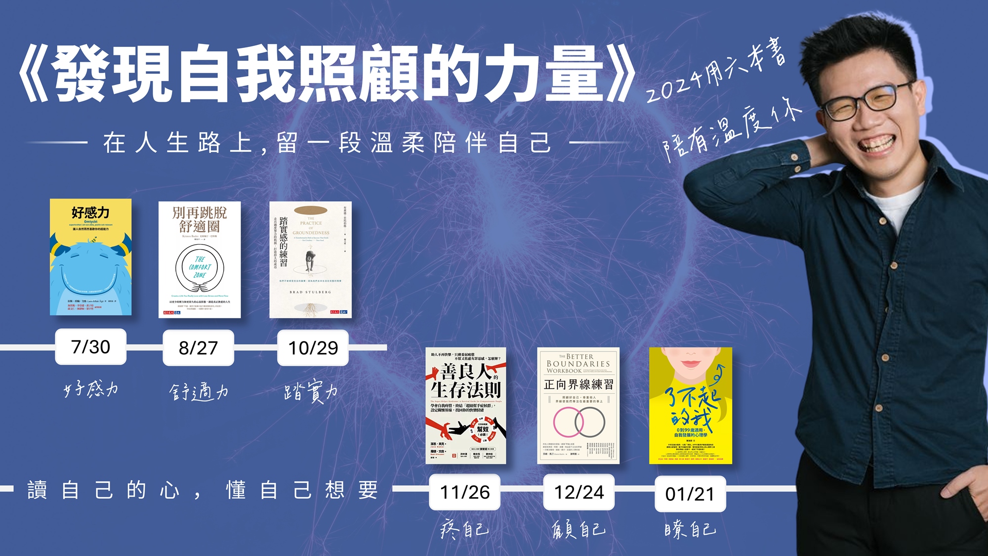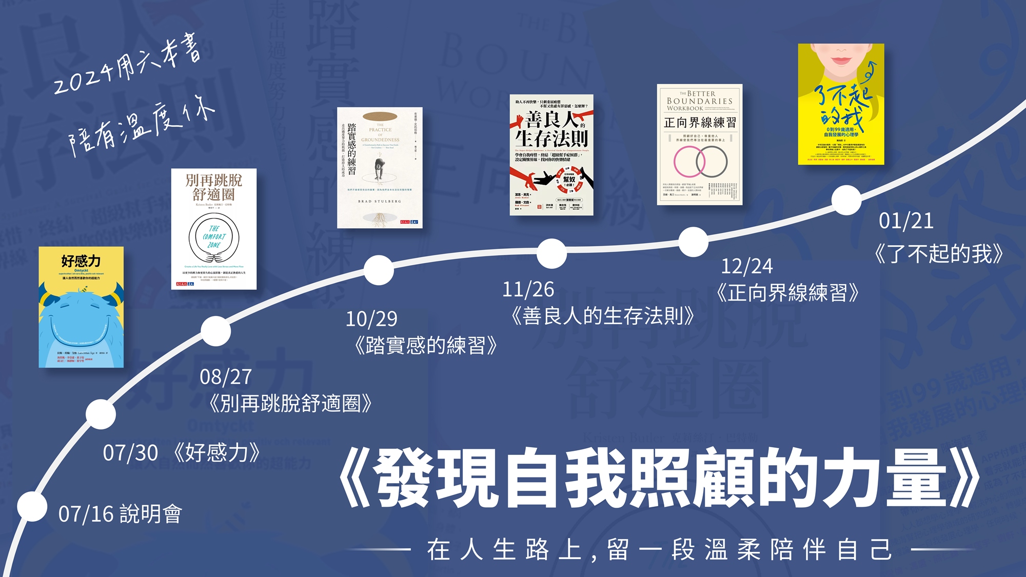 《發現自我照顧的力量》系列主題讀書會時間表,晚上 9:00-10:30 免費線上讀書會