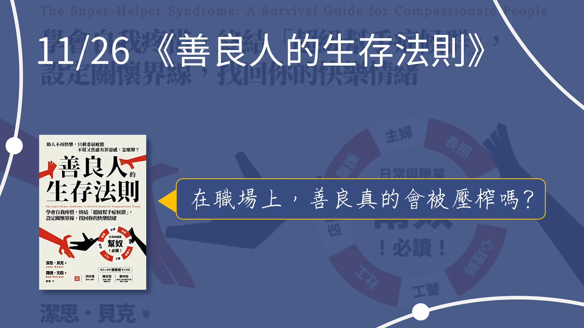 『發現自我照顧的力量』主題讀書會| 11/26《善良人的生存法則》- 學會疼自己,終結超級幫手症候群