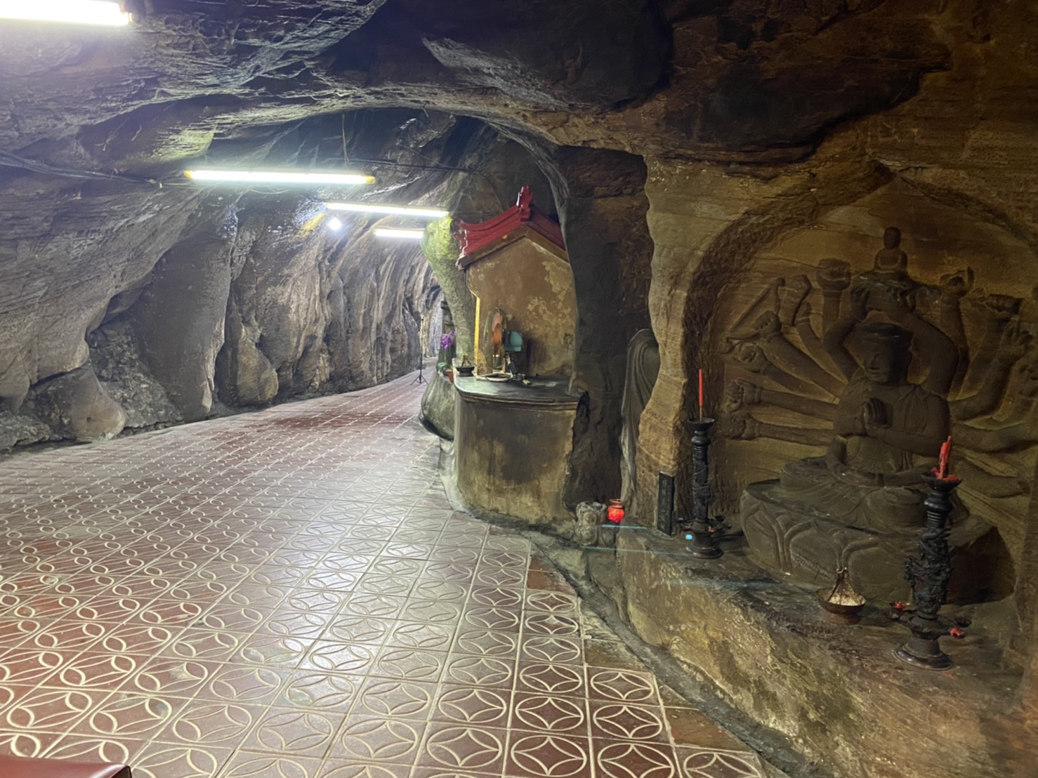 從右邊進入道最內側的是大雄寶殿,二側石壁上有李榮坤先生雕飾的石雕佛像,包含普賢菩薩、文殊菩薩、地藏王菩薩以及觀世音菩薩等諸佛菩薩,個個都是唯妙唯肖、栩栩如生。再加上日治時代遺留下來的二尊觀音石佛,分別是西國三十三所第九番和第十番,這裡儼然化身成了一座天然石雕藝術展館,難怪「小敦煌」的美名稱號不徑而走。