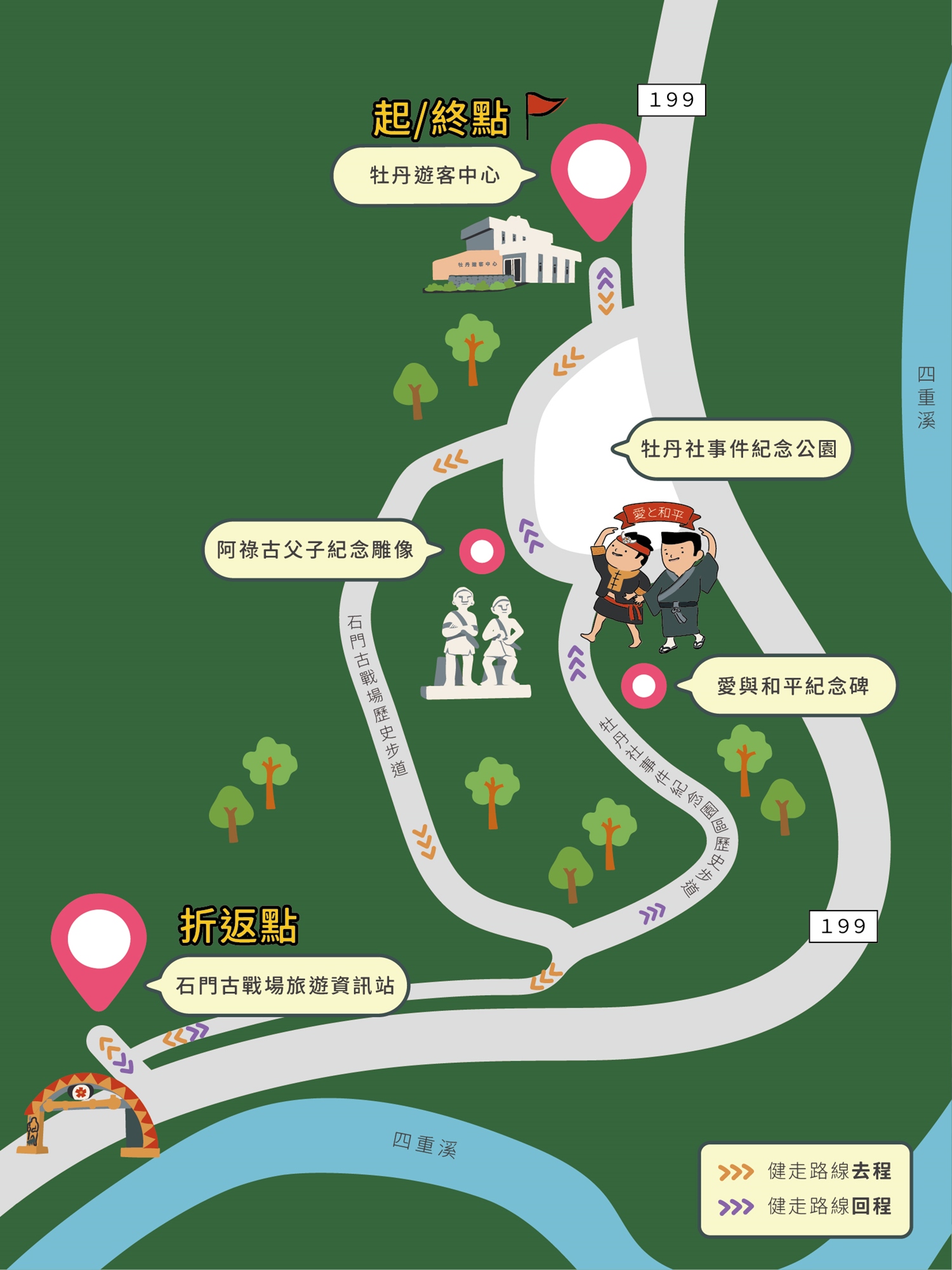以牡丹社紀念公園周邊為健走路線設計,在健走過程中,走訪重要歷史事件場域,認識牡丹社事件,同時鍛鍊健康體魄,致敬當年英勇的部落前輩