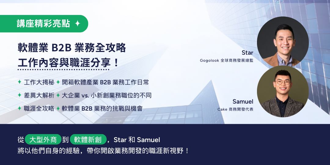 本次 Cake 邀請曾任職於 Salesforce, IBM, Appier 的 Star,以及在軟體新創開啟職涯的 Samuel,分享他們的第一手業務職涯故事。透過兩位講者的親身經歷,你將一窺軟體產業務工作日常,以及了解身在大型外商、軟體新創擔任業務可能遇到的挑戰和機會,為未來做好準備!