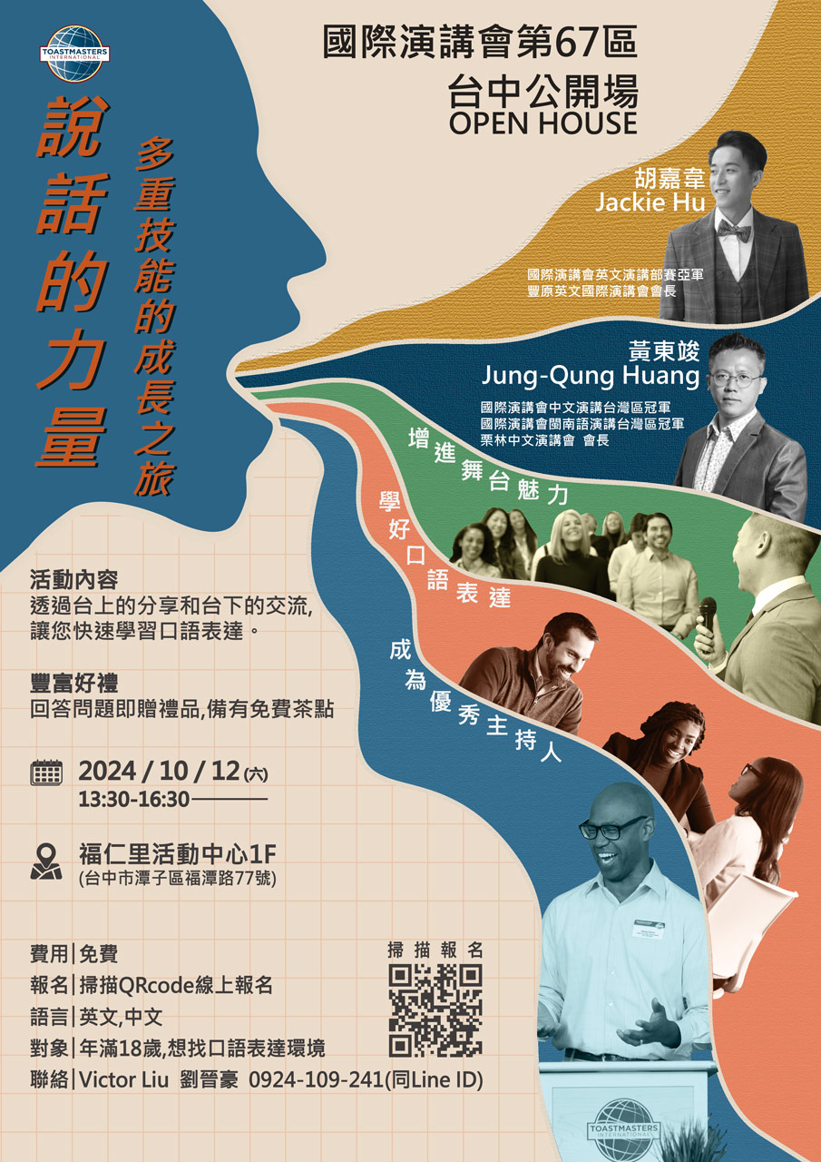 免費茶點及有獎徵答,透過台上的分享和台下的交流,讓您在輕鬆愉快的氛圍下了解自信溝通的力量,誠摯邀請您與家人一同參與。