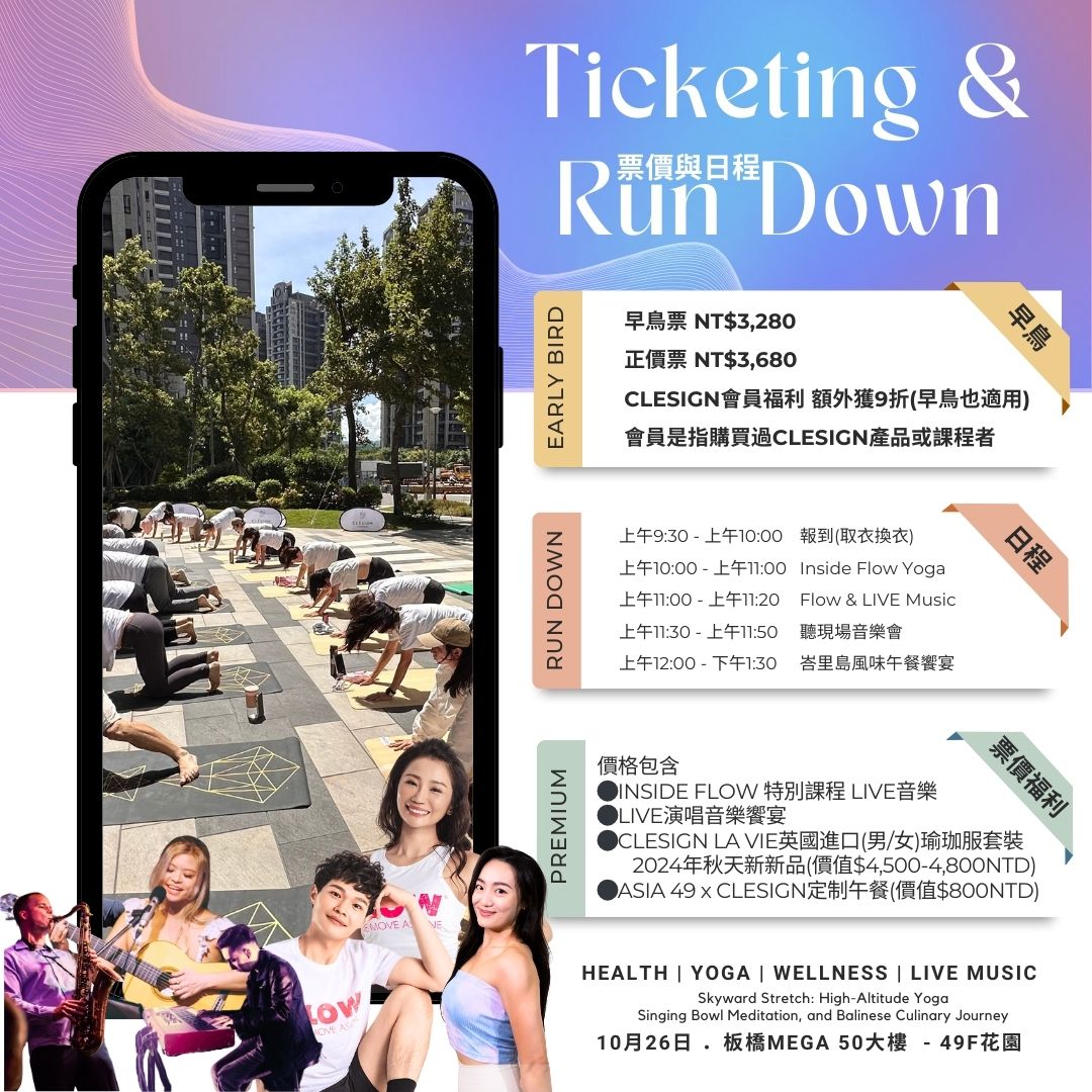 在台北板橋Mega 49樓的天台,再來一場與眾不同的瑜伽體驗!這是一場結合音樂與瑜伽的靈魂盛宴,由Inside Flow Taiwan Team與三位國際音樂團隊現場LIVE演奏,讓每一個動作都與音樂完美融合,帶您進入一個流動與音符交織的心靈世界。隨後,我們將為您奉上精緻的午餐饗宴,讓這場身心靈之旅在天際線上畫下完美句點。