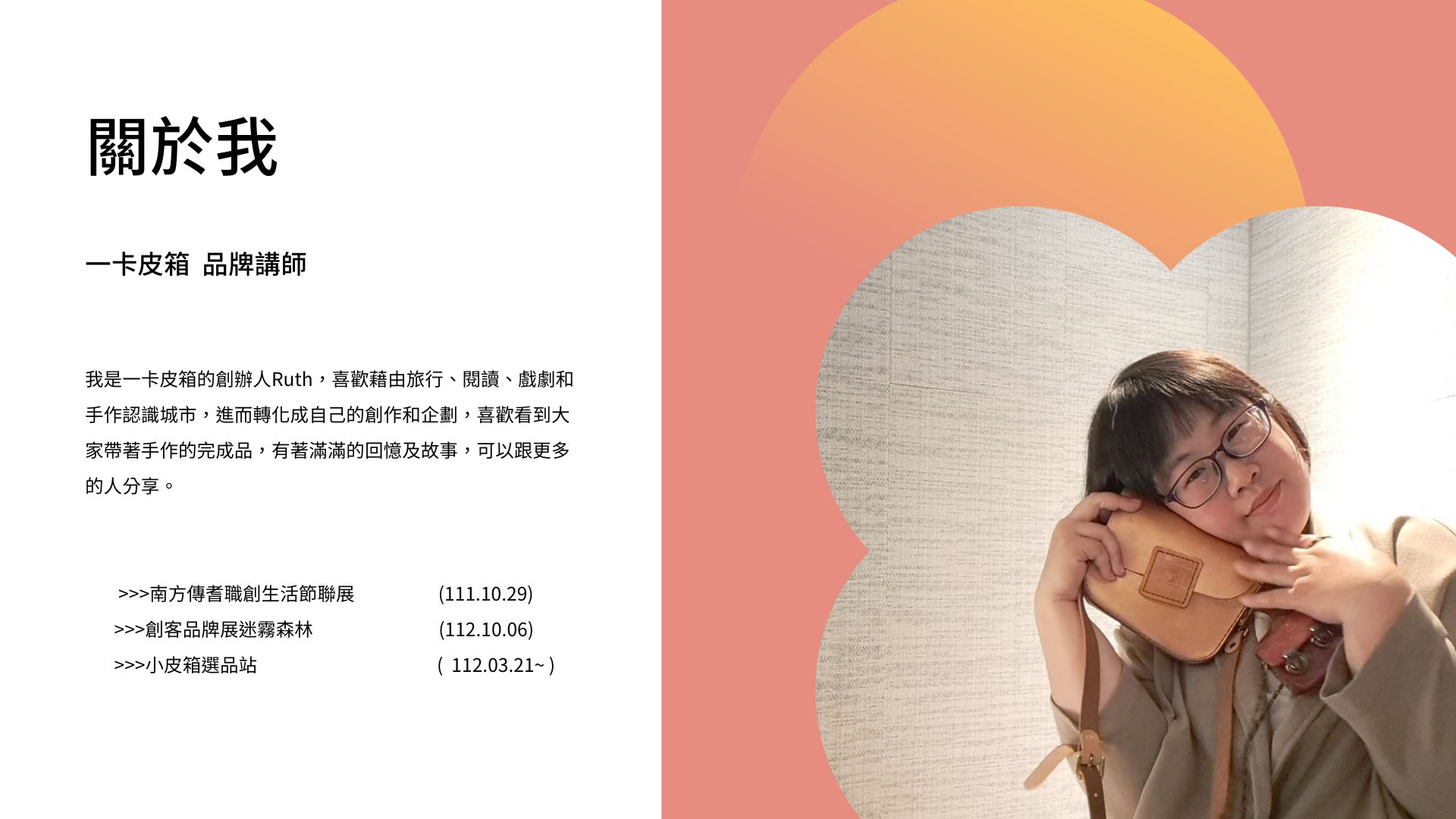 嗨~我是一卡皮箱的創辦人Ruth,喜歡藉由旅行、閱讀、戲劇和手作認識城市,進而轉化成自己的創作和企劃,喜歡看到大家帶著手作的完成品,有著滿滿的回憶及故事,所以設計了許多課程等你來發掘。