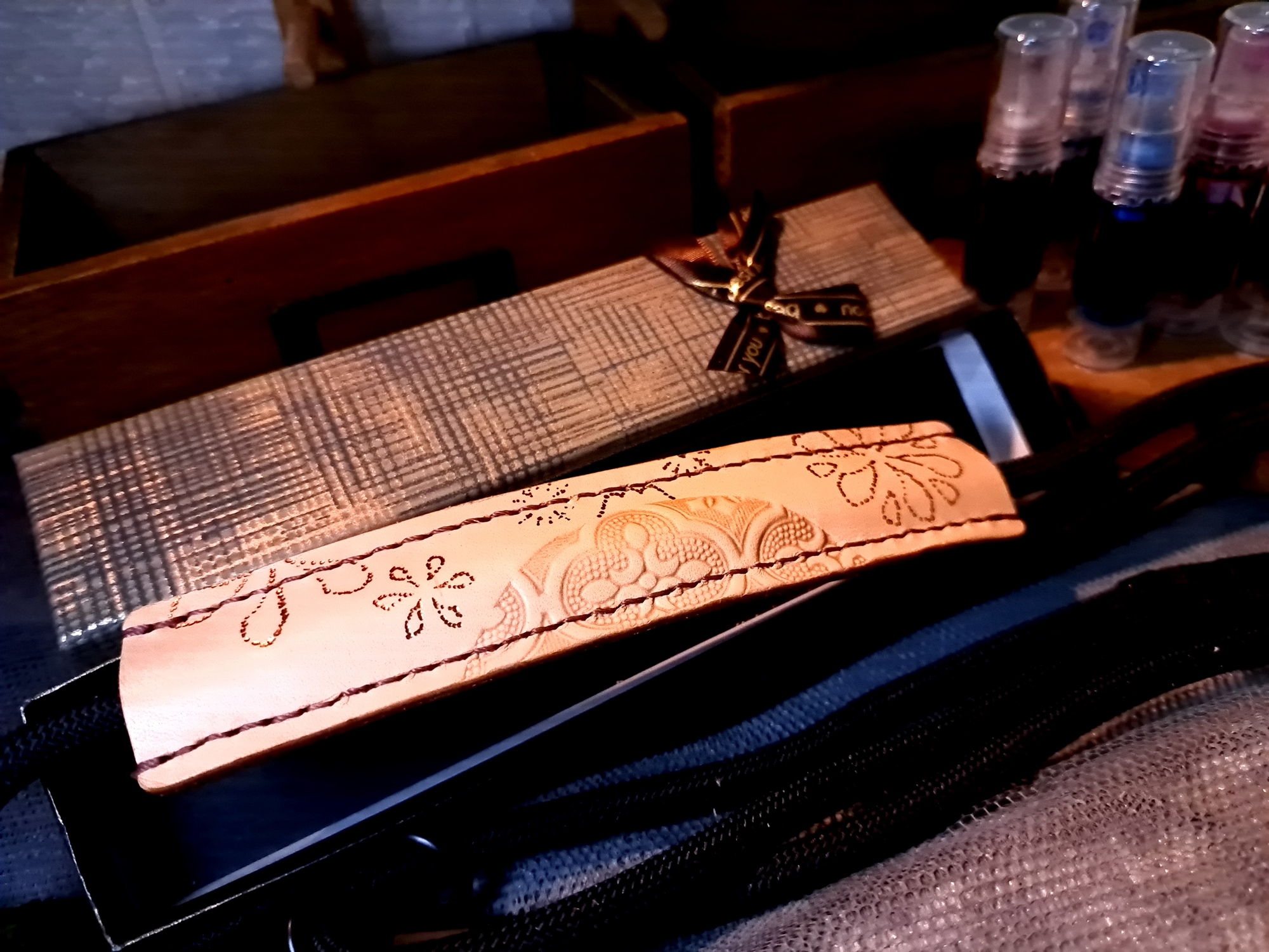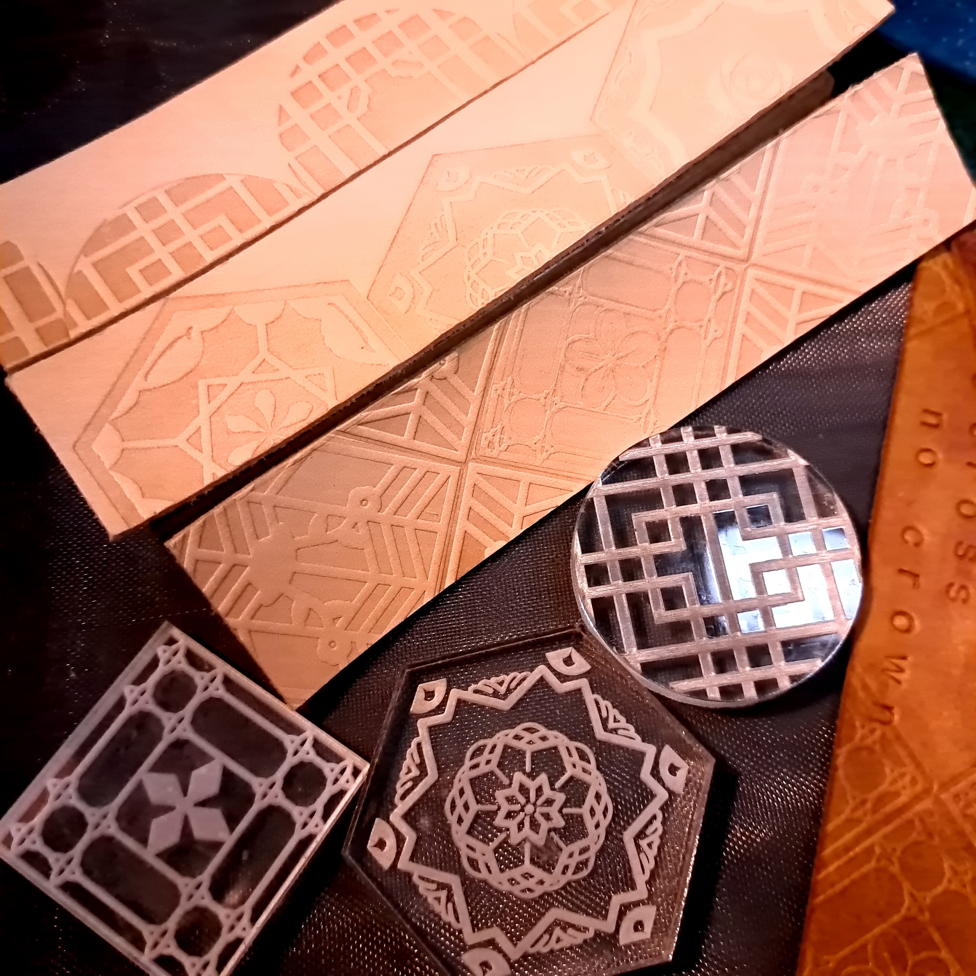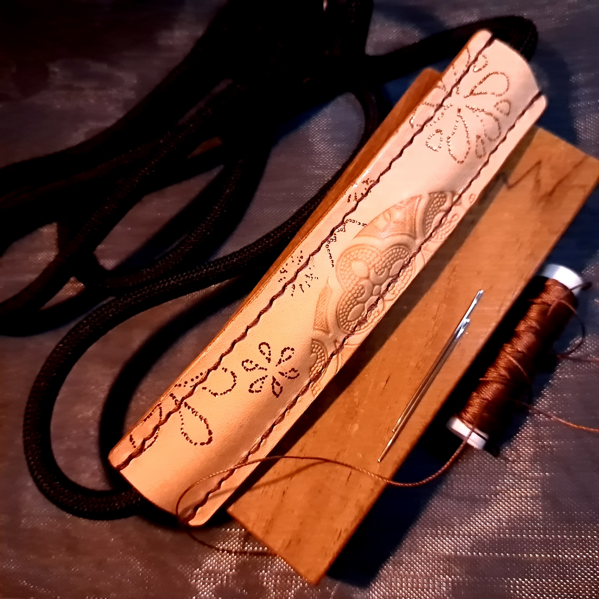 5.材料包:雷雕圖樣植鞣皮革2個、手機掛繩1個、掛件組2組、染劑、固色劑、磨邊版、蠟線、手縫針