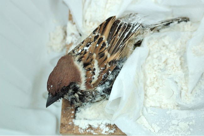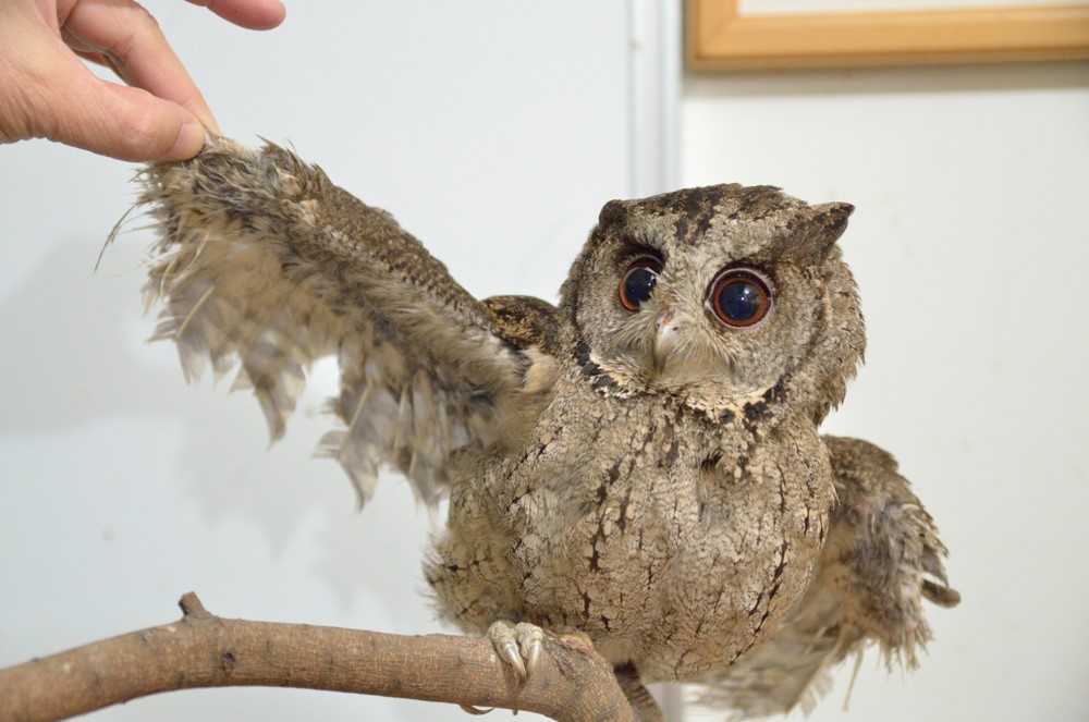 翅膀受損的領角鴞與被困在粘鼠板的麻雀(照片來源:蔣功國)