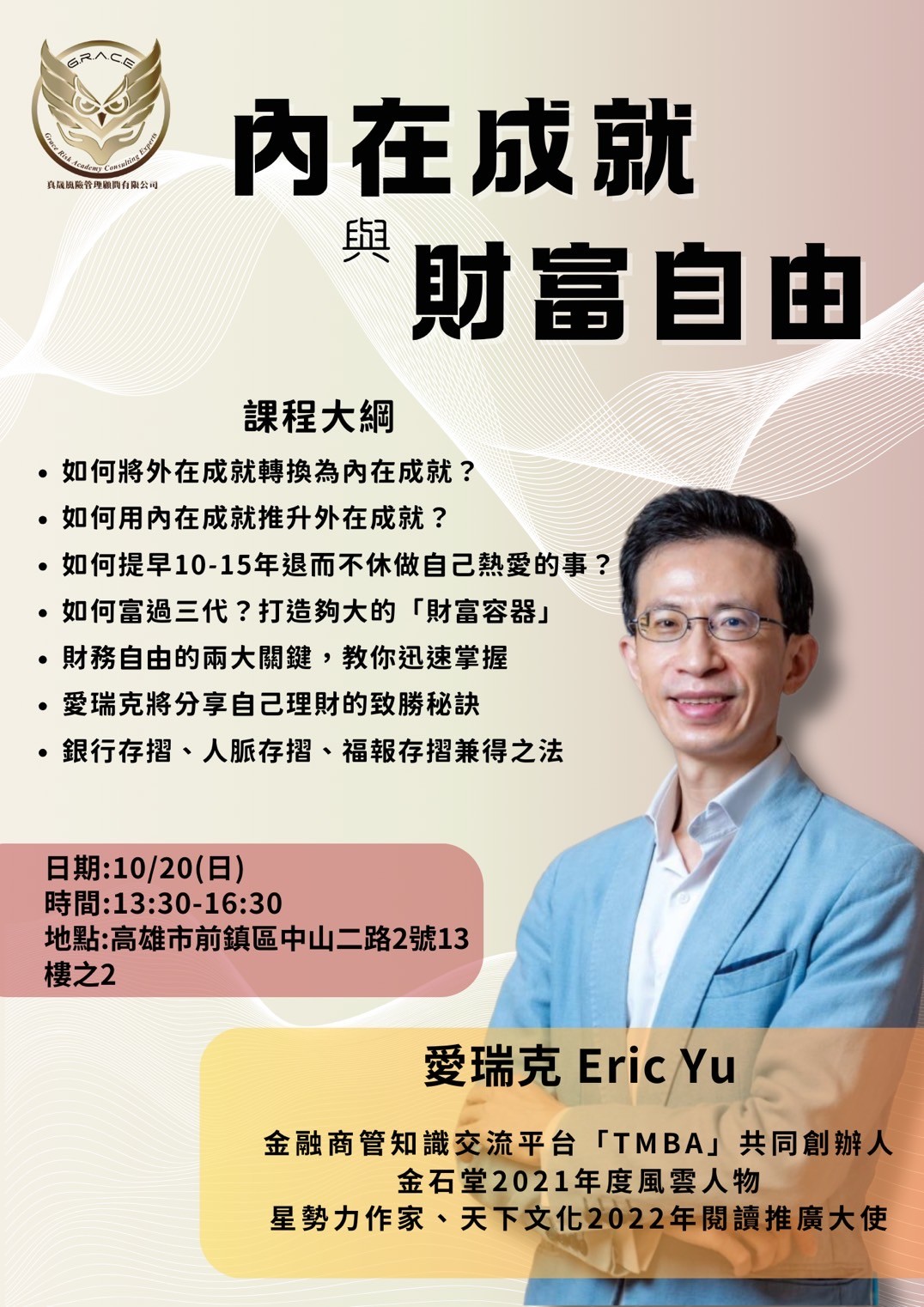 二度面臨財產歸零!TMBA 愛瑞克 40 歲達成財富自由,由本尊來談談財富自由,作對方法,從零也能開始,乾貨滿滿,無論您是否聽過愛瑞克的演講,絕對不能錯過這一場,愛瑞克特別為這場講座重新詮釋,唯一一次現場實做的內容,只為讓每一個來的你,得到更多從內在成就到財富自由的關鍵,記得帶上一隻筆喔~