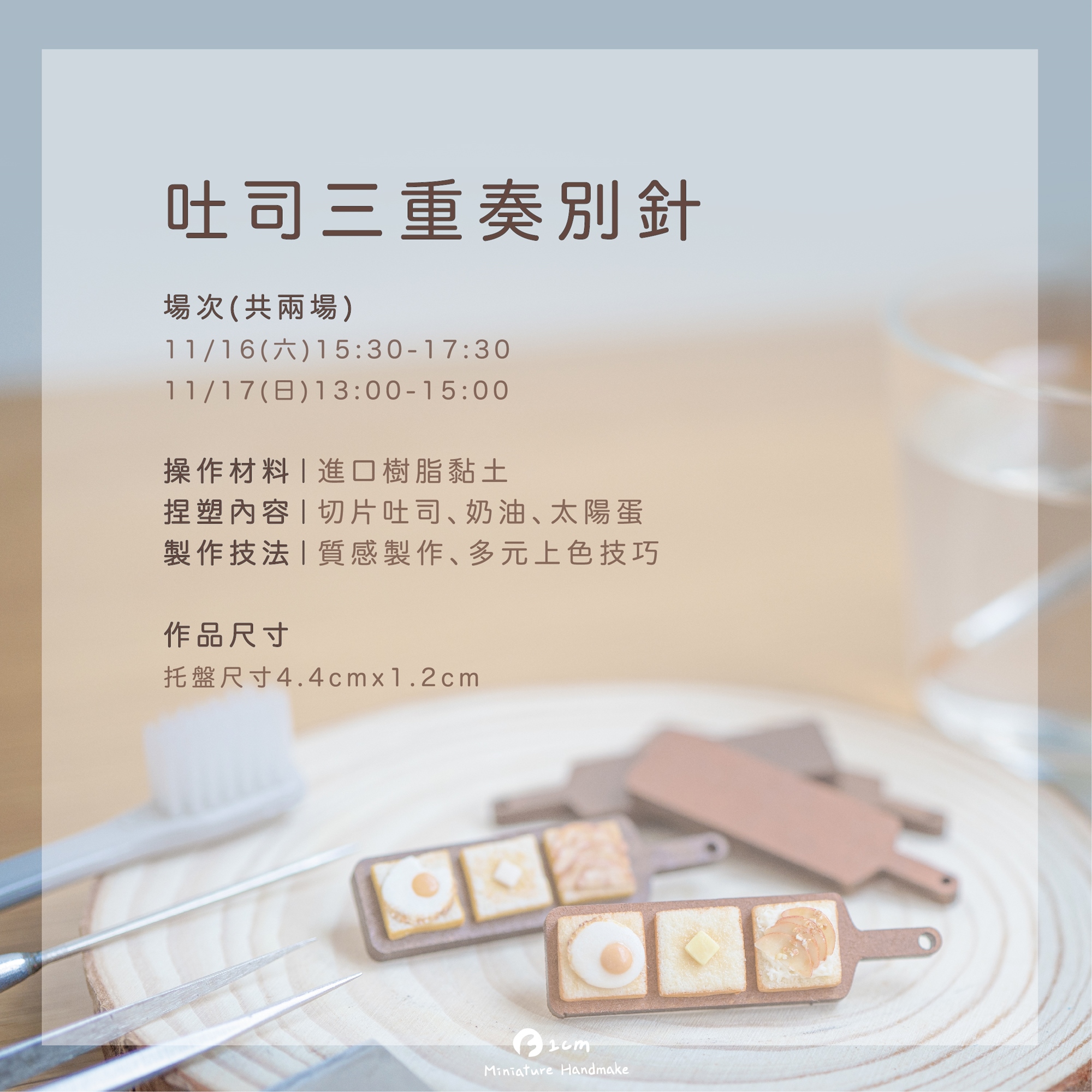 吐司三重奏別針工作坊,以簡單的手法製作出好看又精緻的三種袖珍吐司:奶油吐司、蛋吐司、蘋果吐司,無論新手或平時有在製作袖珍黏土的朋友都能簡單上手!