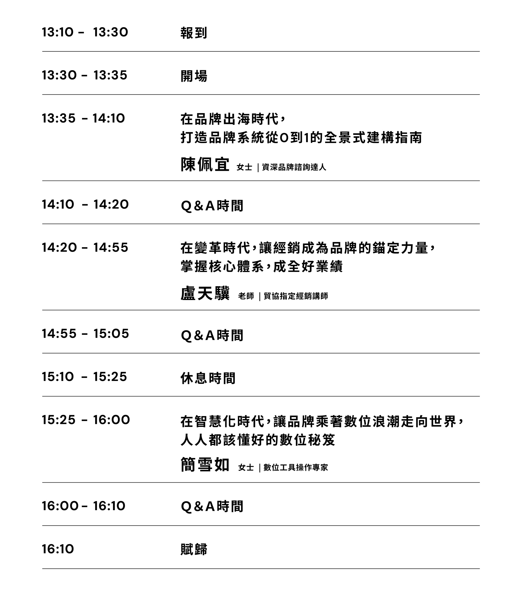 在這場兼具品牌管理,經銷體系,數位行銷三大核心議題的分享會中,透過演講者的精彩演繹,深入探索品牌出海的關鍵要素,從品牌定位到數位行銷,提供您最完整的品牌出海指南。讓我們單刀直入重點核心,助力品牌行銷國際!