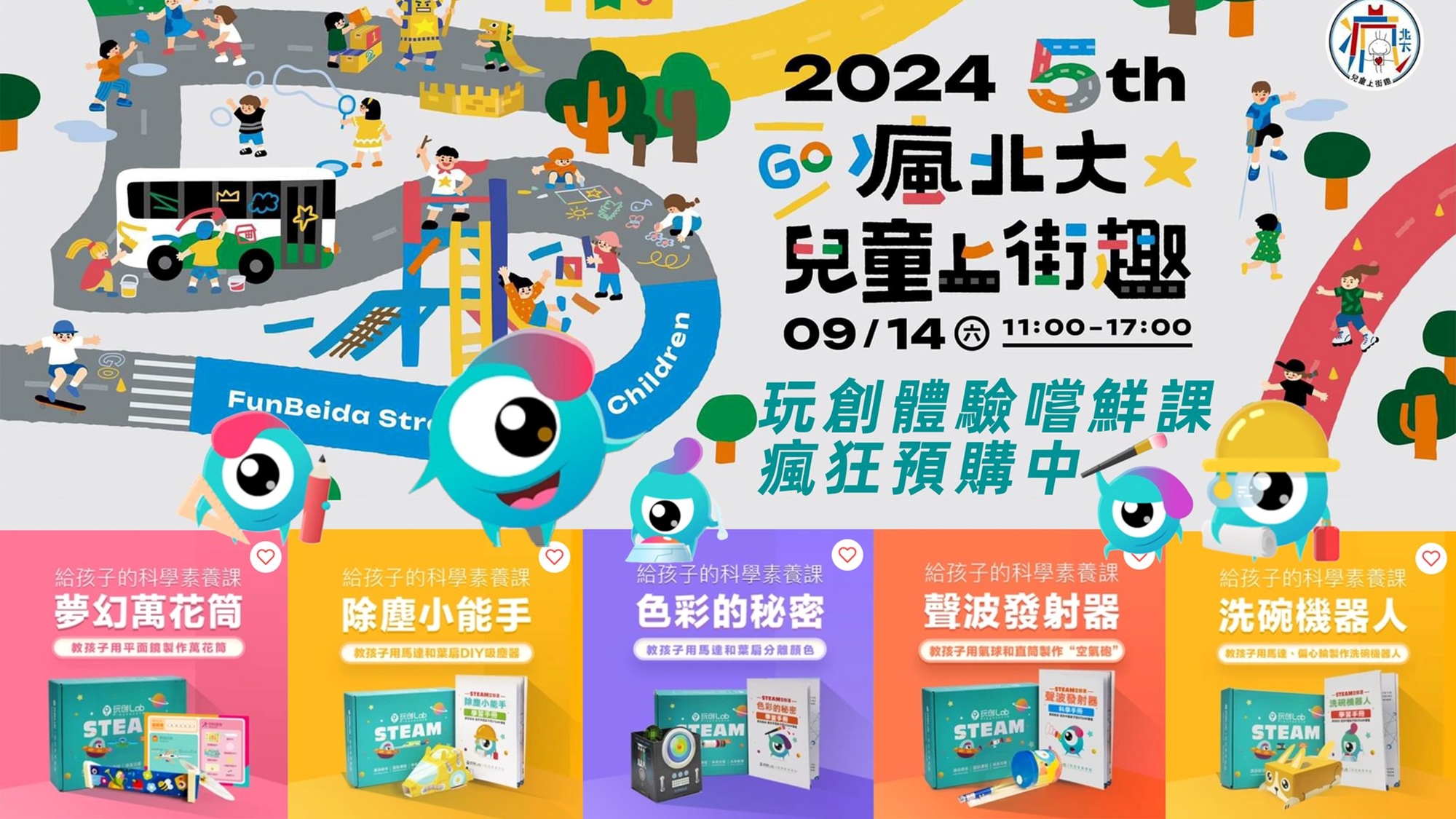 喜歡動手動腦的STEAM嗎?9月14日當天,玩創未來 現場有很會玩的老師帶領孩子一起體驗喔! 買課程送教具,預購打五折! 快來看看喜歡什麼課吧!