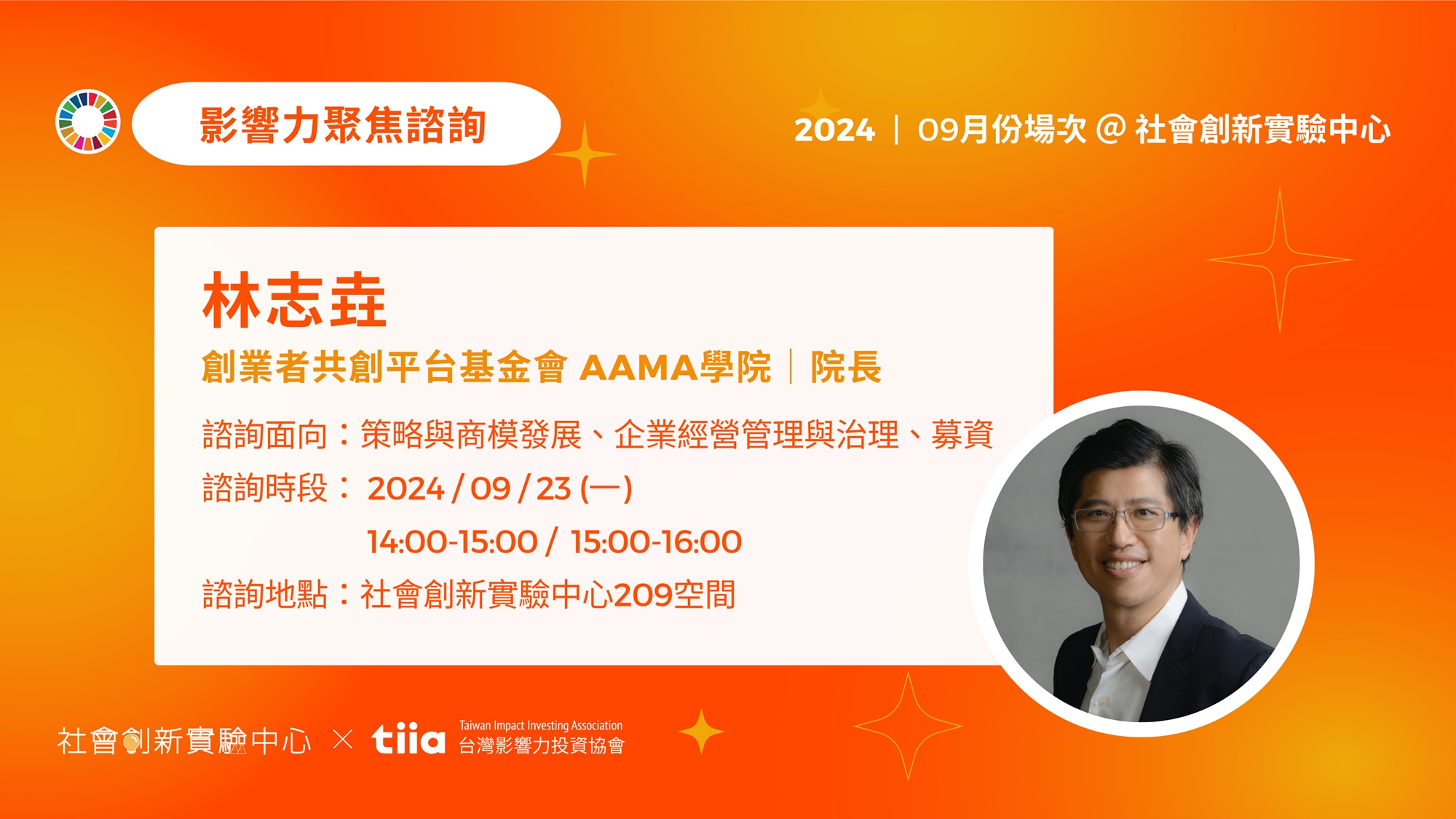 是由社會創新實驗中心(社創中心)與台灣影響力投資協會(tiia)合作的公益諮詢活動,將安排影響力投資、及各界專業領域大師在社創中心與您進行一對一的實體諮詢幫助創業者解惑。