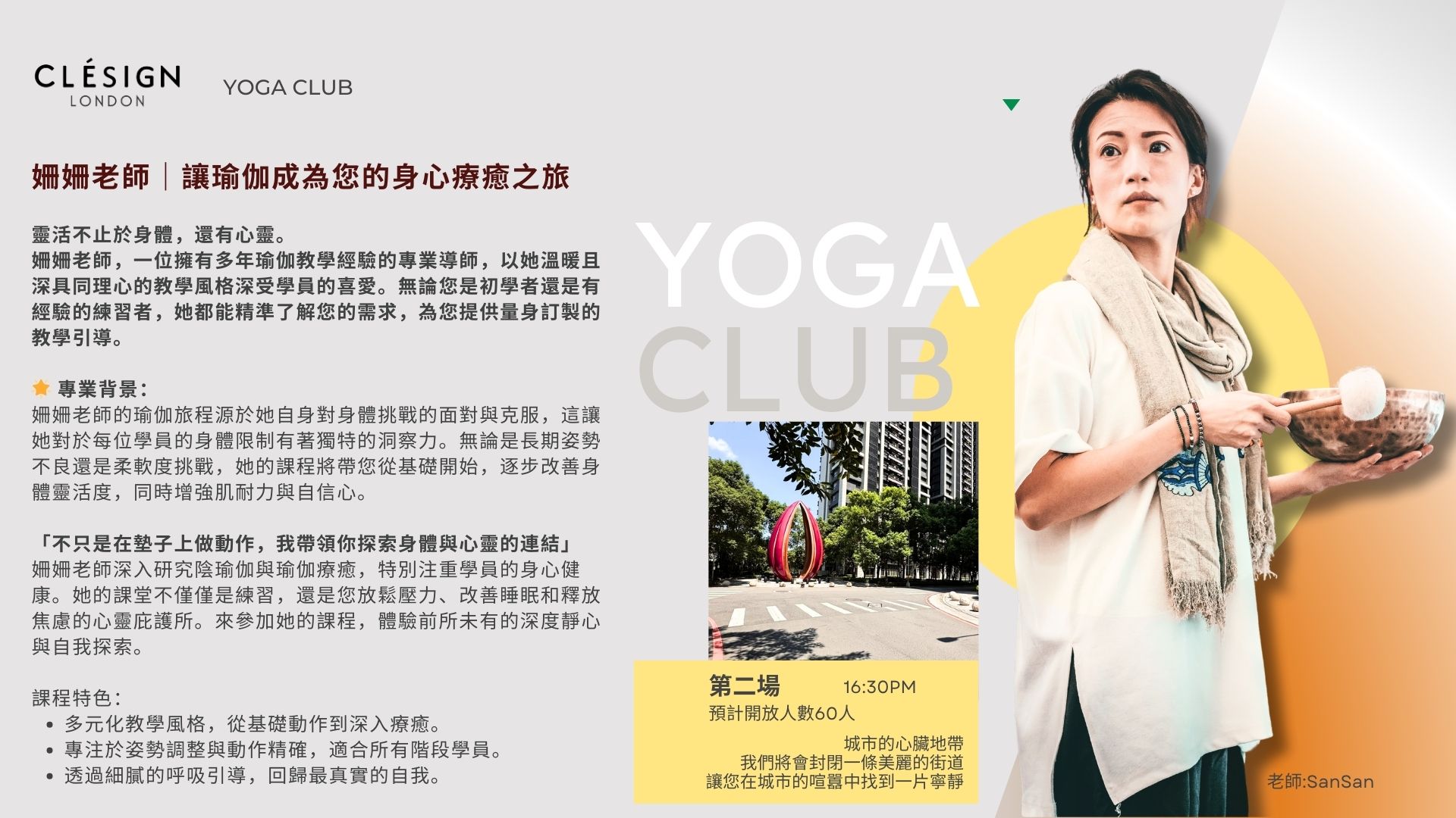 特邀老師:姍姍老師——CLESIGN STUDIO的資深專業老師,擁有豐富的瑜伽教學經驗。她以溫和且精確的教學風格,特別適合有身體限制的學員,幫助他們從基礎開始逐步提升靈活度與自信心。姍姍老師擅長運用陰瑜伽技術,引導學員通過呼吸與動作的結合,進行深度放鬆與療癒。