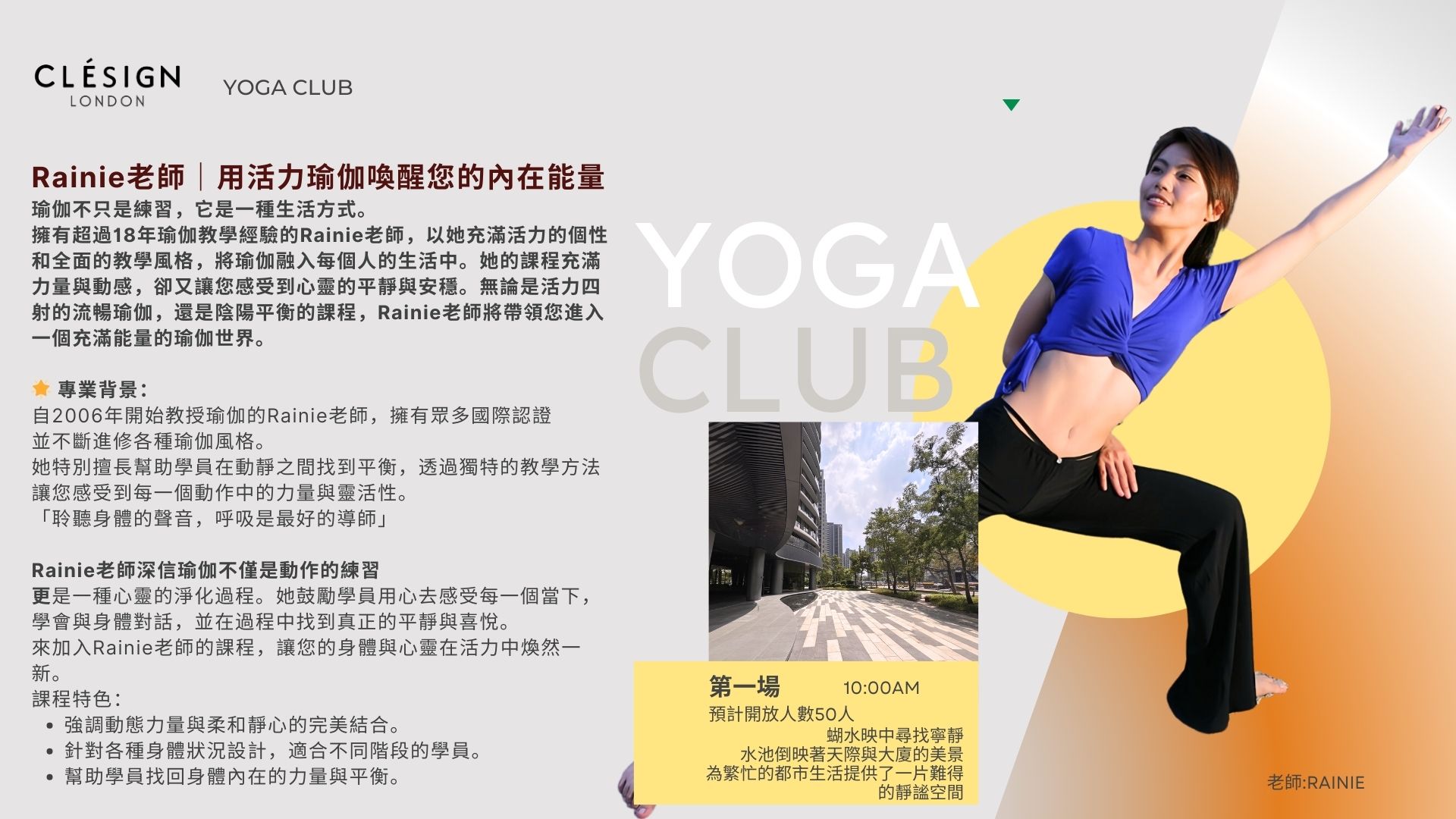 特邀老師:Rainie老師——CLESIGN STUDIO的明星老師,擁有18年瑜伽教學經驗。她的課程風格充滿活力,尤其擅長火箭瑜伽與陰陽瑜伽的結合,帶領學員在動靜之間找到完美的平衡。Rainie老師強調通過呼吸與動作的協調,讓身體達到最佳狀態。