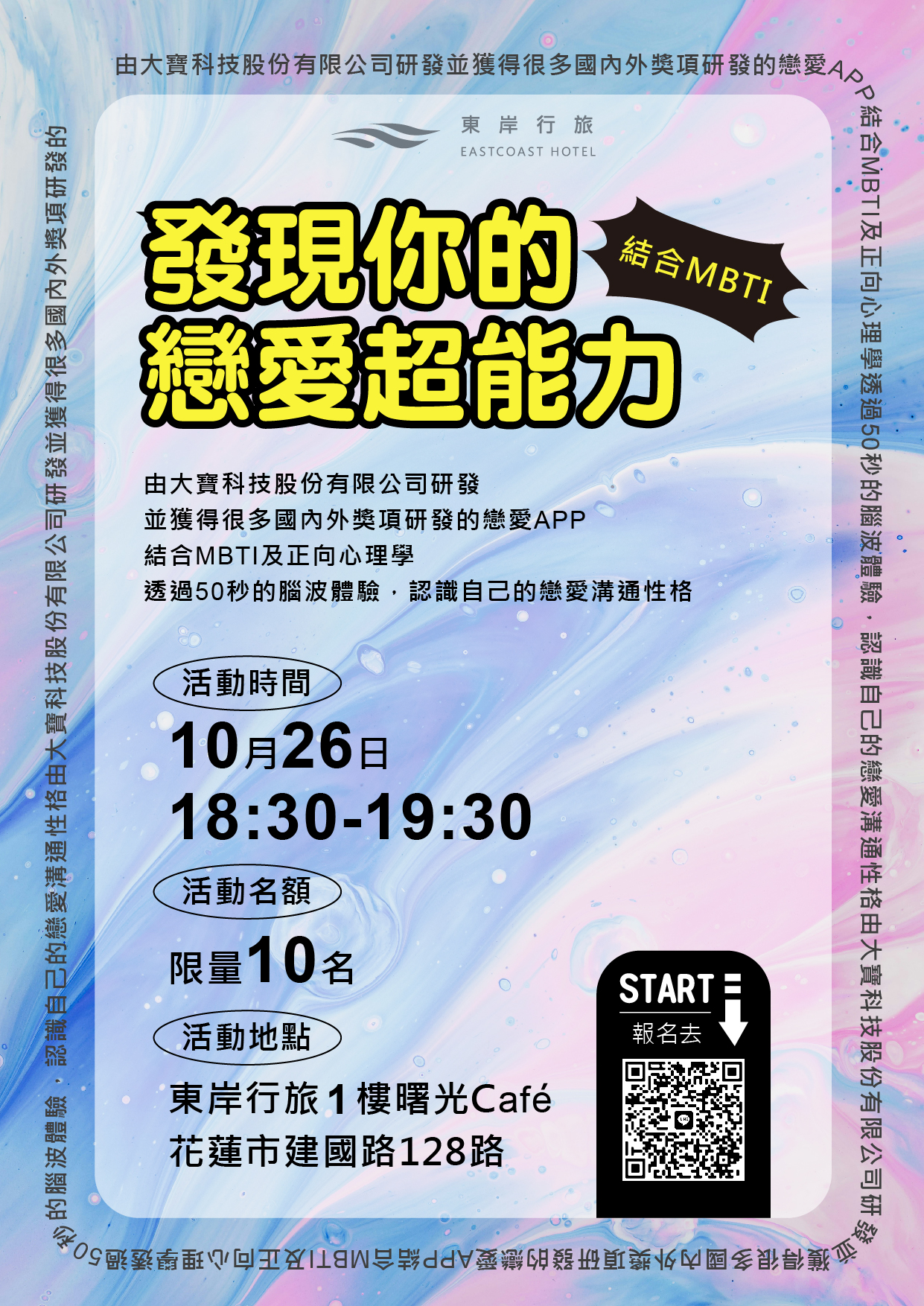10/26的體驗活動,結合正向心理學暨AI科技腦波體驗,40秒找到自己的戀愛個性???!!!用對溝通方式、避免感情禁區、誤入雷區、告白踩雷 !!一小時的體驗活動讓您滿載而歸!