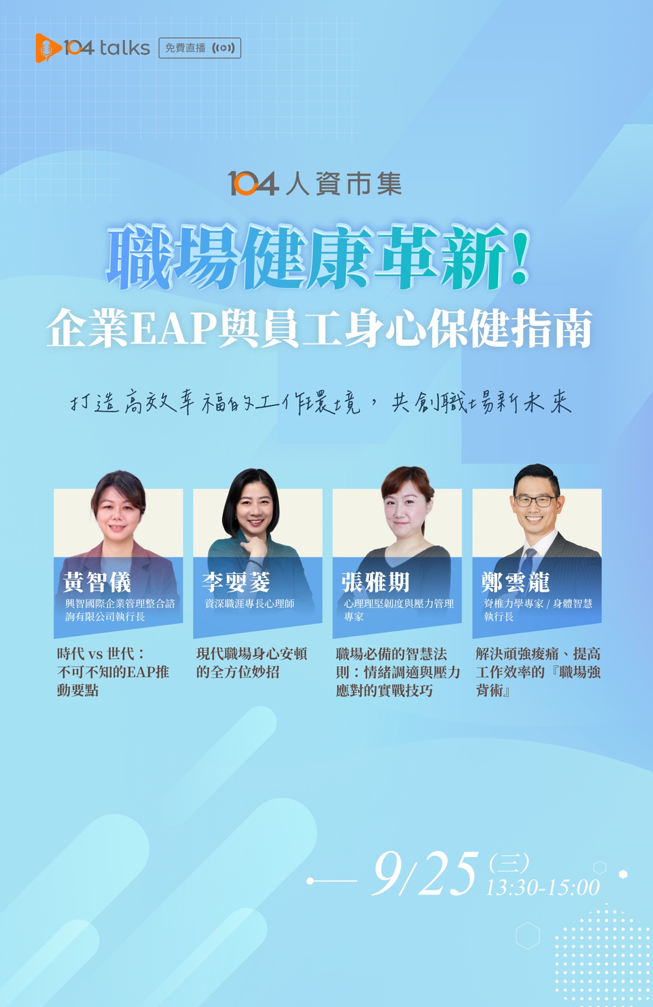 本次講座會分享如何透過EAP(員工協助計畫)與全面身心保健措施雙管齊下,讓每位員工知道如何安頓身心,並協助企業建立支持系統,邀請各企業一起加入職場健康革新,共創更具幸福感和可持續發展的職場未來!