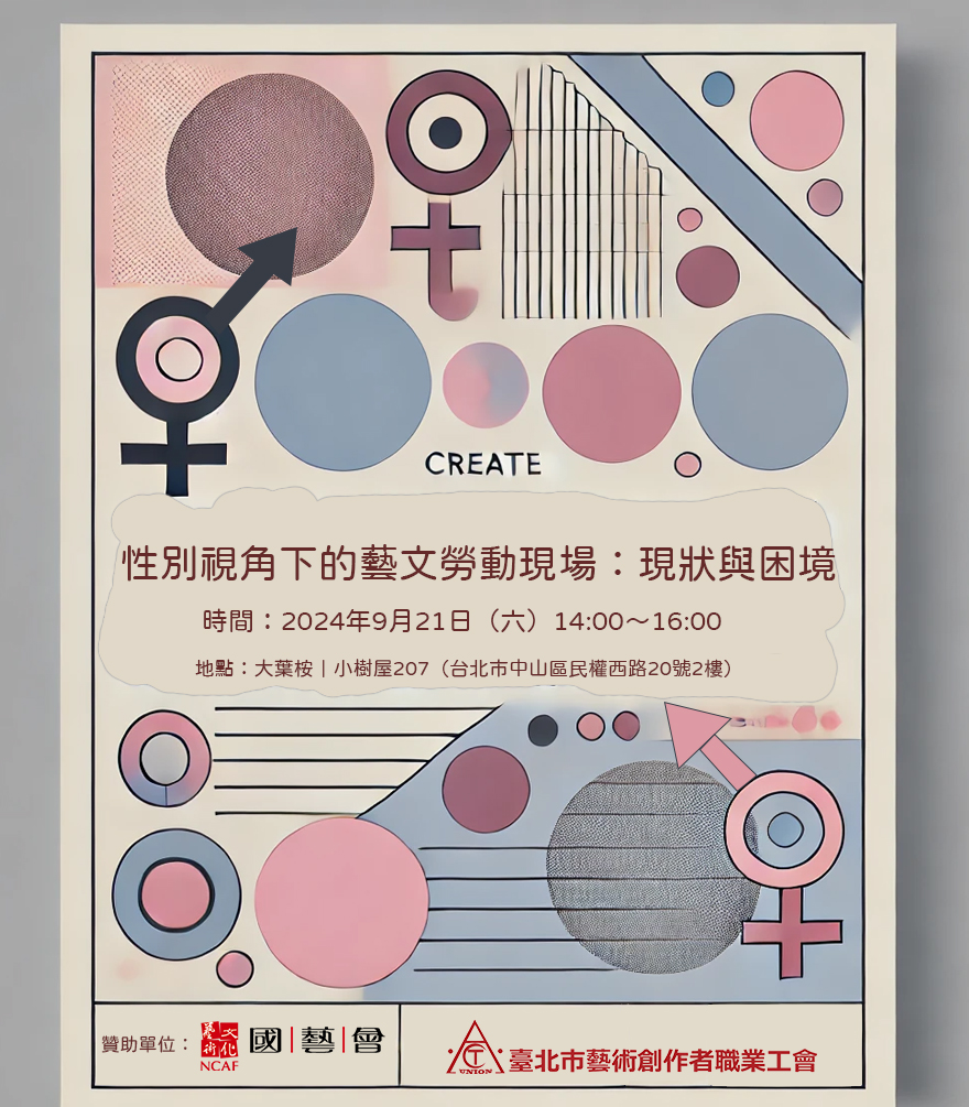 本次講座為今年「性別平等與勞動情況調查」系列之一,將聚焦於性別視角下的藝文勞動現場,試圖探討當前在藝文界依然嚴峻的性平問題。
