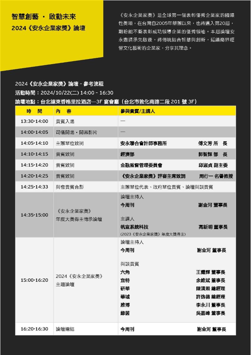 《安永企業家獎》是全球第⼀個表彰優秀企業家的國際性獎項,在台灣自2005年舉辦以來,今年邁入第20屆,期盼能不斷表彰成功領導企業的優秀領袖。本屆《安永企業家獎》論壇邀請承先啟後,將傳統結合智慧與創新,延續商界經營文化藝術的企業家,分享其經營理念與策略。