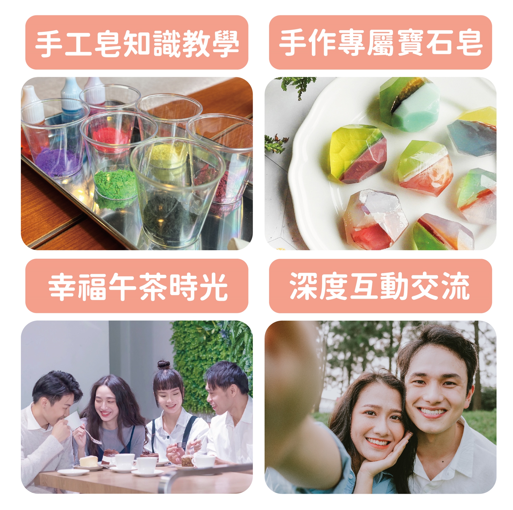 手作海洋寶石手工皂,非常討喜的寶石形狀及透徹的設計,猶如在美麗的大海中潛水看到的多彩珊瑚礁,由專業師資帶領,協助學員做出專屬自己喜歡的配色手工皂,男女兩兩一組,共同完成甜蜜又美麗的手工藝品,活動間更可看出對方的細心體貼,相互協助。