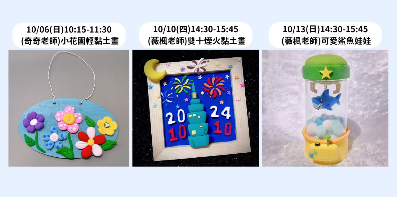 【注意事項】輕黏土手作課3人成班,於開課前2日12:00前統計人數,若無成班將主動通知,請留意來電或報名信箱。(成班不另行通知)