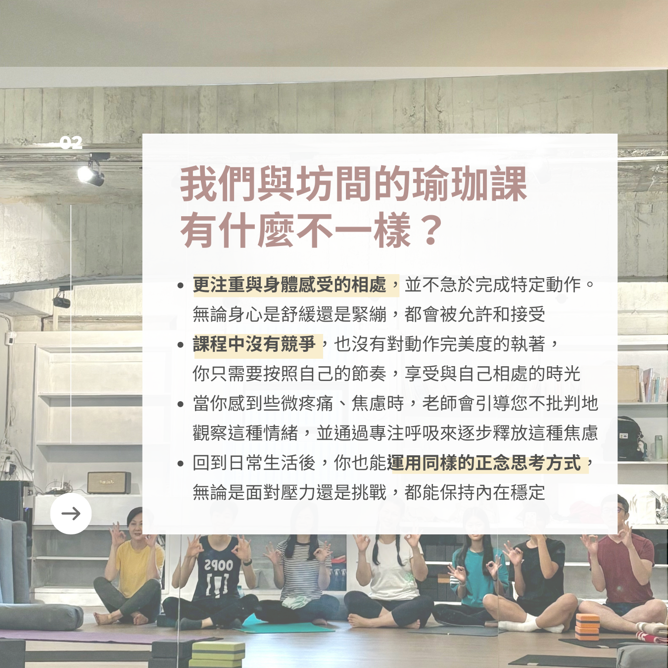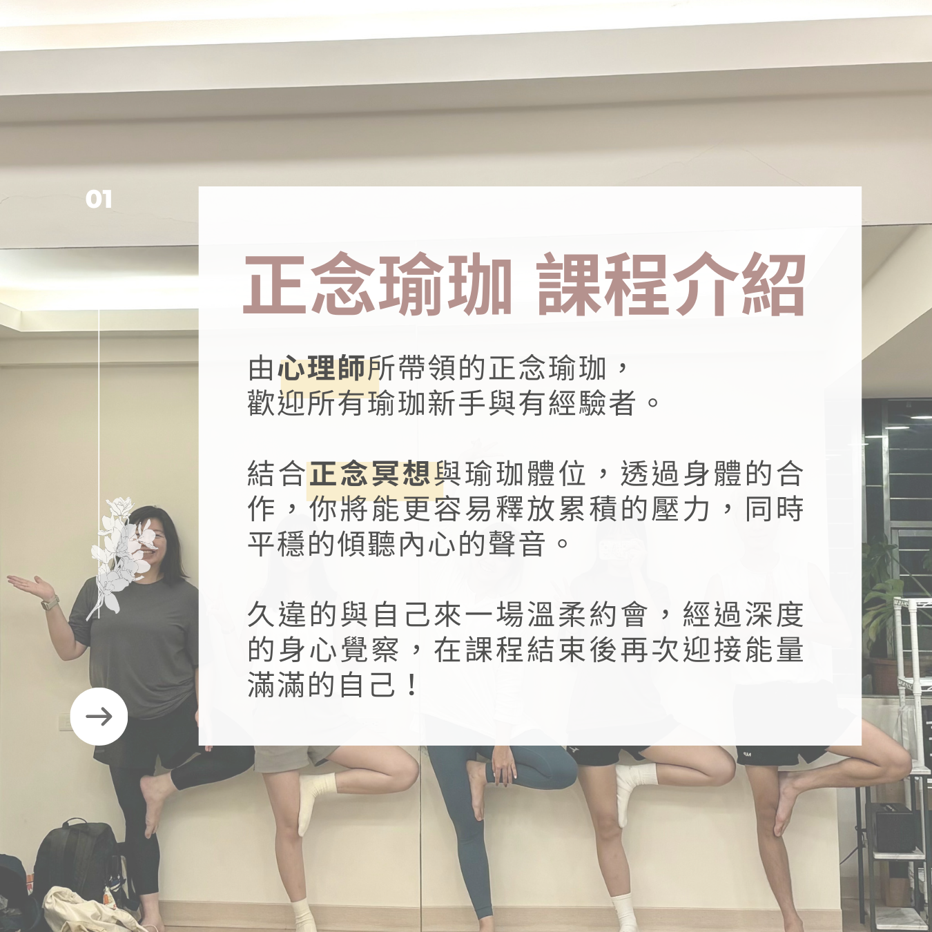 - 想重新開始做瑜珈:曾有瑜珈經驗,但因外在因素中斷,想以紓壓導向、富有安全感的課程環境重新開始