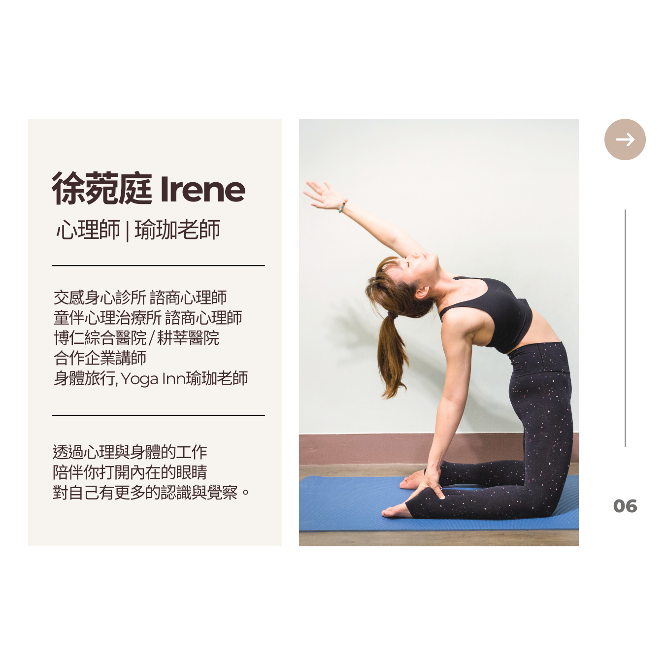 徐菀庭 Irene老師 課程費用 $750 - 9/29 (日) 13:00-14:30 正念瑜珈