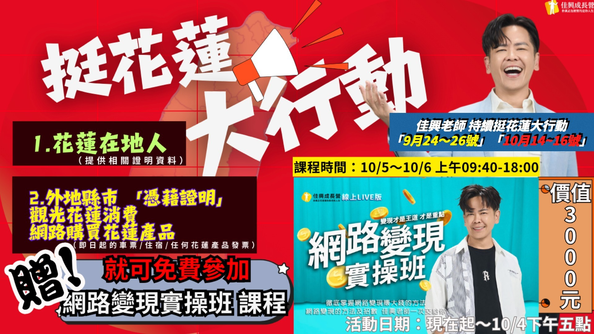 即日起你挺花蓮,佳興成長營挺你贈送[10/5-10/6網路變現實操班] 線上版價值NTD3000