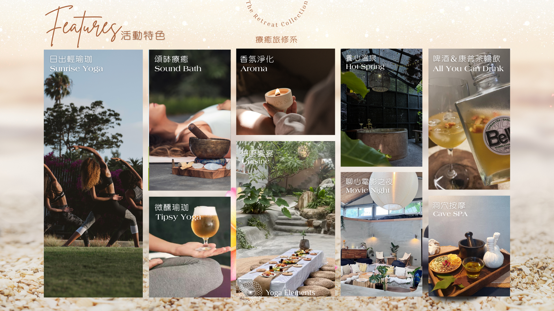 - 多元療癒活動: 從微醺瑜珈、頌缽與銅鑼浴、暖心溫泉到私廚饗宴與電影之夜等豐富的活動,提供多層次的療癒與感官享受。