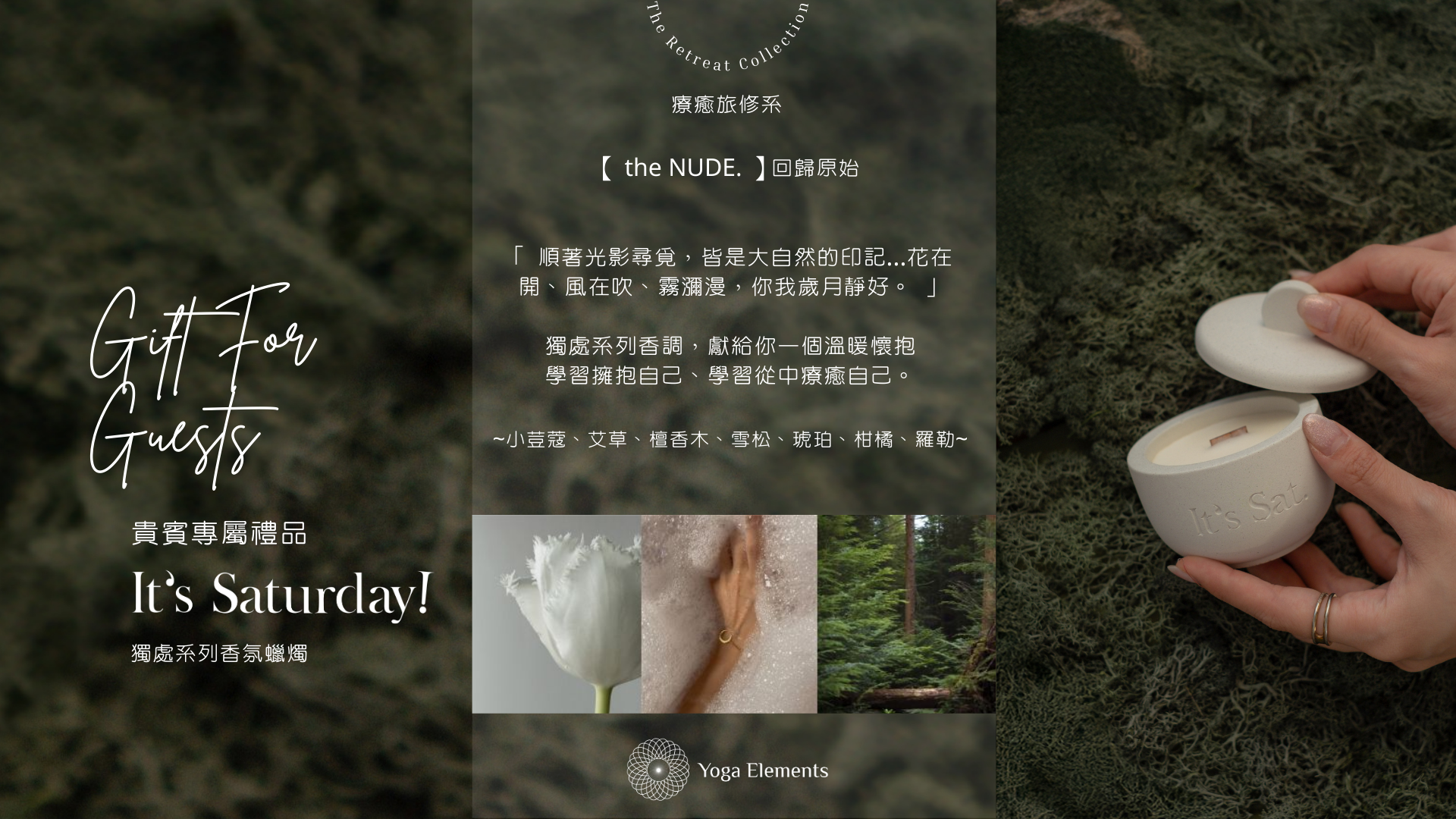 - 專屬禮品: 本次小雨林靜心湯旅將贈送每位貴賓一組It’s Saturday 靜心香氛禮盒(價值NT$990 ),以小荳蔻、艾草、檀香木、雪松、柑橘、羅勒調為香氣主調,在靜修之旅後將療癒香氛帶回家中。