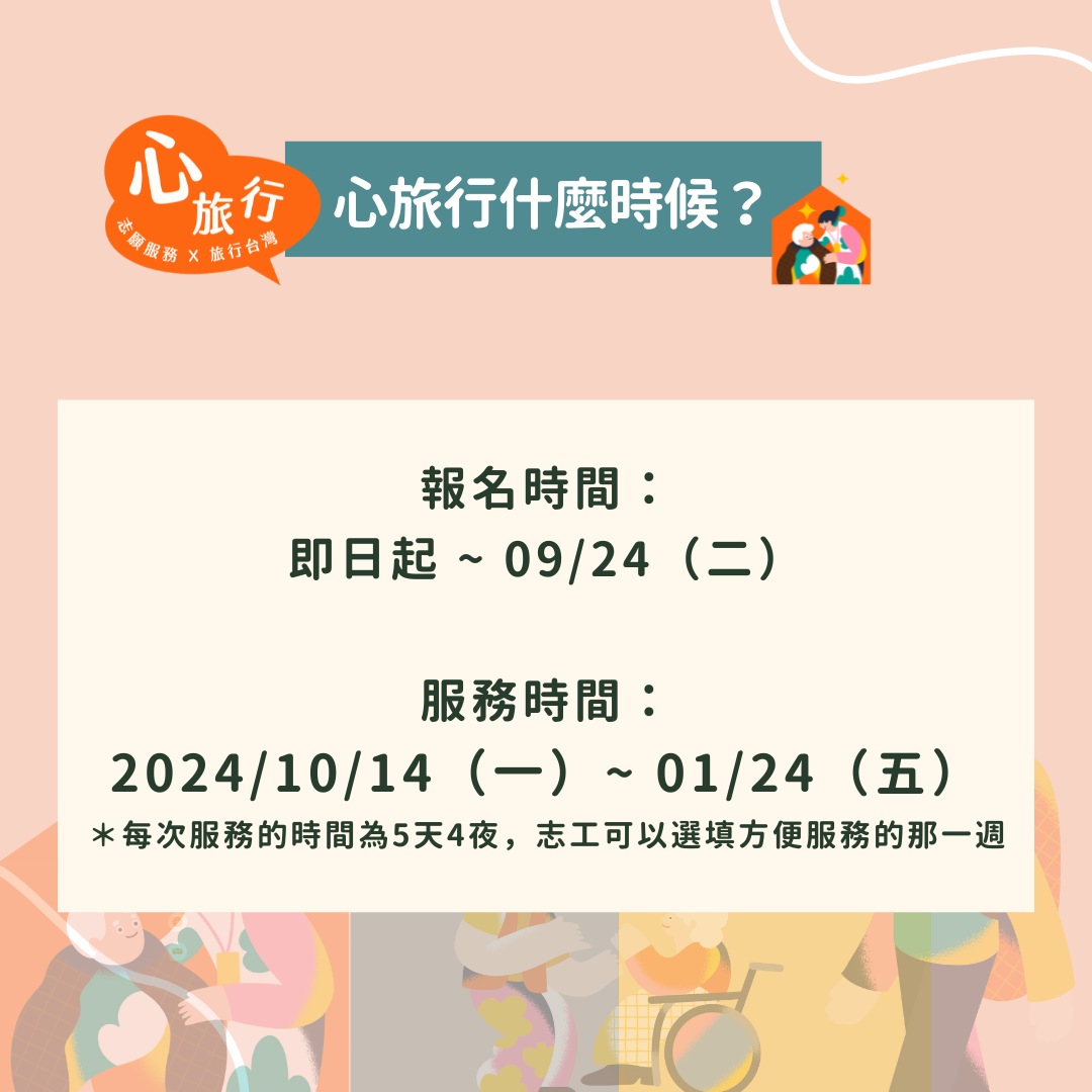 多數人做志工的時間以假日為主,但其實平日也有人力的需求!為了讓單位在平日更有餘裕,我們協助招募志工在平日進行為期 5天4夜 的服務,且在服務之餘,志工也有機會到附近來一趟輕旅行,更加認識台灣各地的生活樣貌!