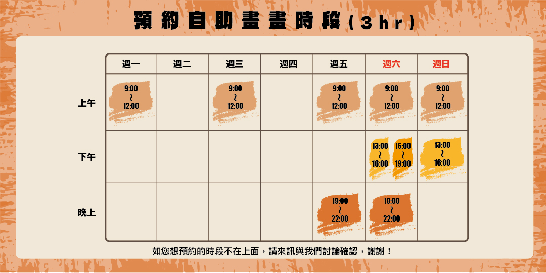 目前自助繪畫的開放時段如下(時段皆可討論)