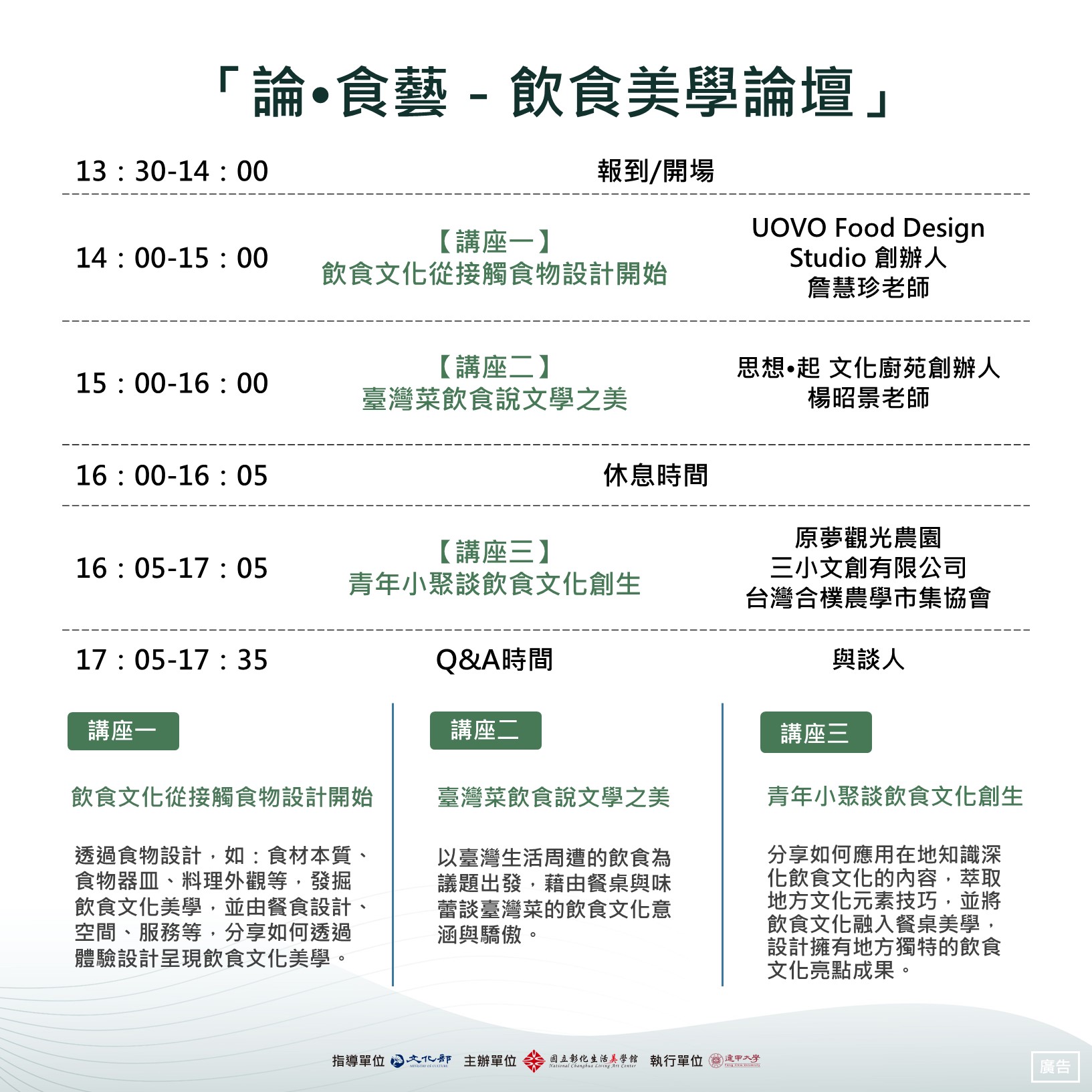 活動說明:探討如何透過食物設計、臺灣菜詮釋和在地文化元素,呈現飲食文化之美學,並透過專家講座與青年分享,深入解析飲食文化的創生與實踐。