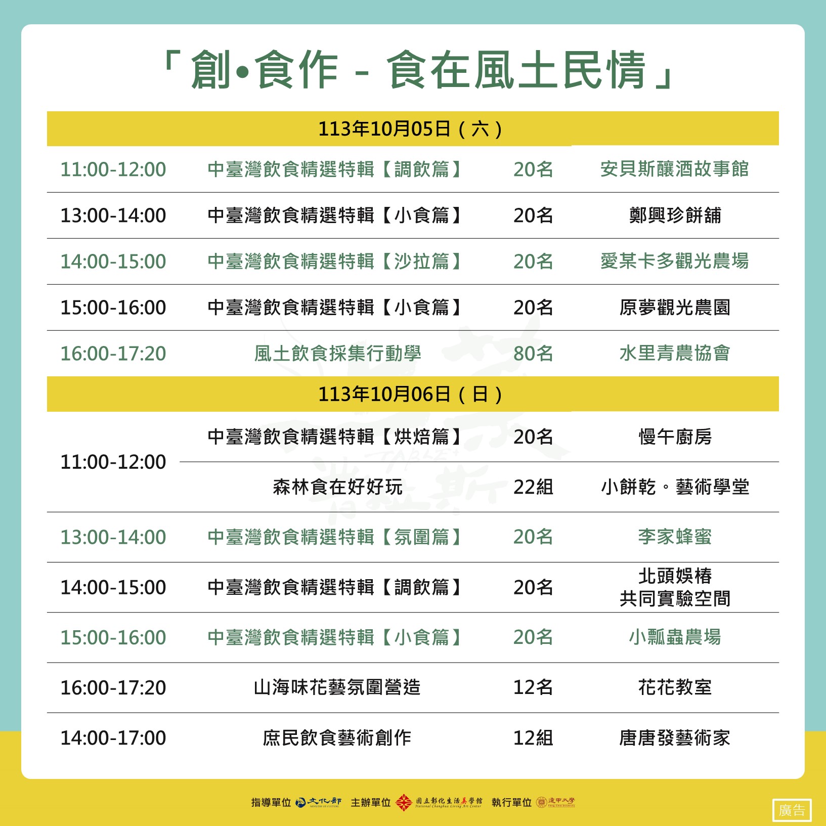 活動說明:以中臺灣飲食文化為主軸,結合山海風土特色,透過飲食品嘗、DIY手作等多元體驗形式,深入呈現地方飲食美學與文化意涵。