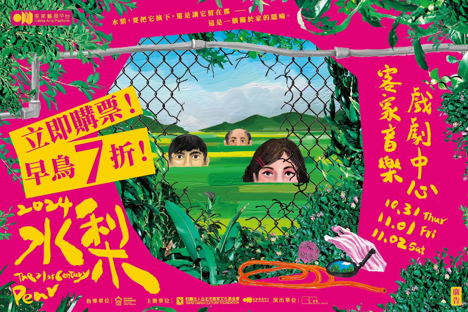 在2024客家藝展平臺—僻室House Peace的全新客語劇作《水梨》舞台劇即將在 10/31-11/02 於臺北市客家音樂戲劇中心二樓劇場演出。正式演出之前,我們特別策劃了一系列《水梨》相關講座,由劇組的核心成員與劇場好朋友分享自身經驗,和民眾分享《水梨》客語創作過程、演出特色,以及排練時遇到的新鮮事及挑戰。歡迎大家一起來聽聽,《水梨》的生長過程💪