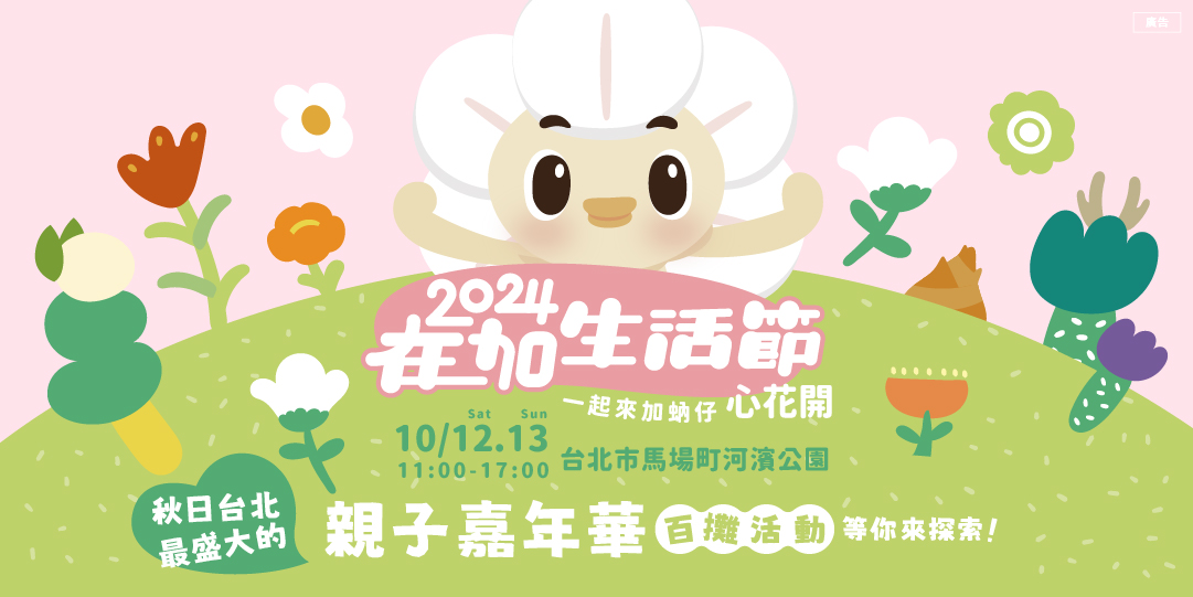 【 2024秋季最好玩的親子嘉年華 - 在加生活節】正式登場! 🎊 好吃、好買、好玩的親子嘉年華,來自「加蚋祭」華麗轉型重磅出擊! 10/12-13,台北市馬場町河濱公園,這是今年秋季台北最好玩的親子活動! 在加生活節結合親子DIY手作、闖關遊戲、萬聖節派對、40+美食市集,適合全家大小參與。 活動由2021年加蚋祭轉型而來,注重親子互動與學習,讓大朋友小朋友都能感受心花怒放的歡樂時光。 🌸趕快搶購早鳥通行證,享受獨家DIY手作和超值限量好禮!
