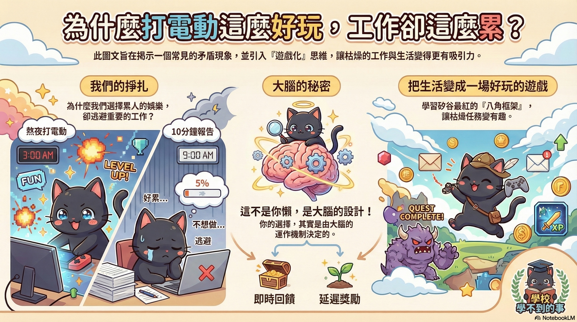 - 切入點: 大家有沒有想過,為什麼我們願意熬夜打電動、追劇、滑手機(這些都很累),卻不願意花十分鐘寫那份工作報告?