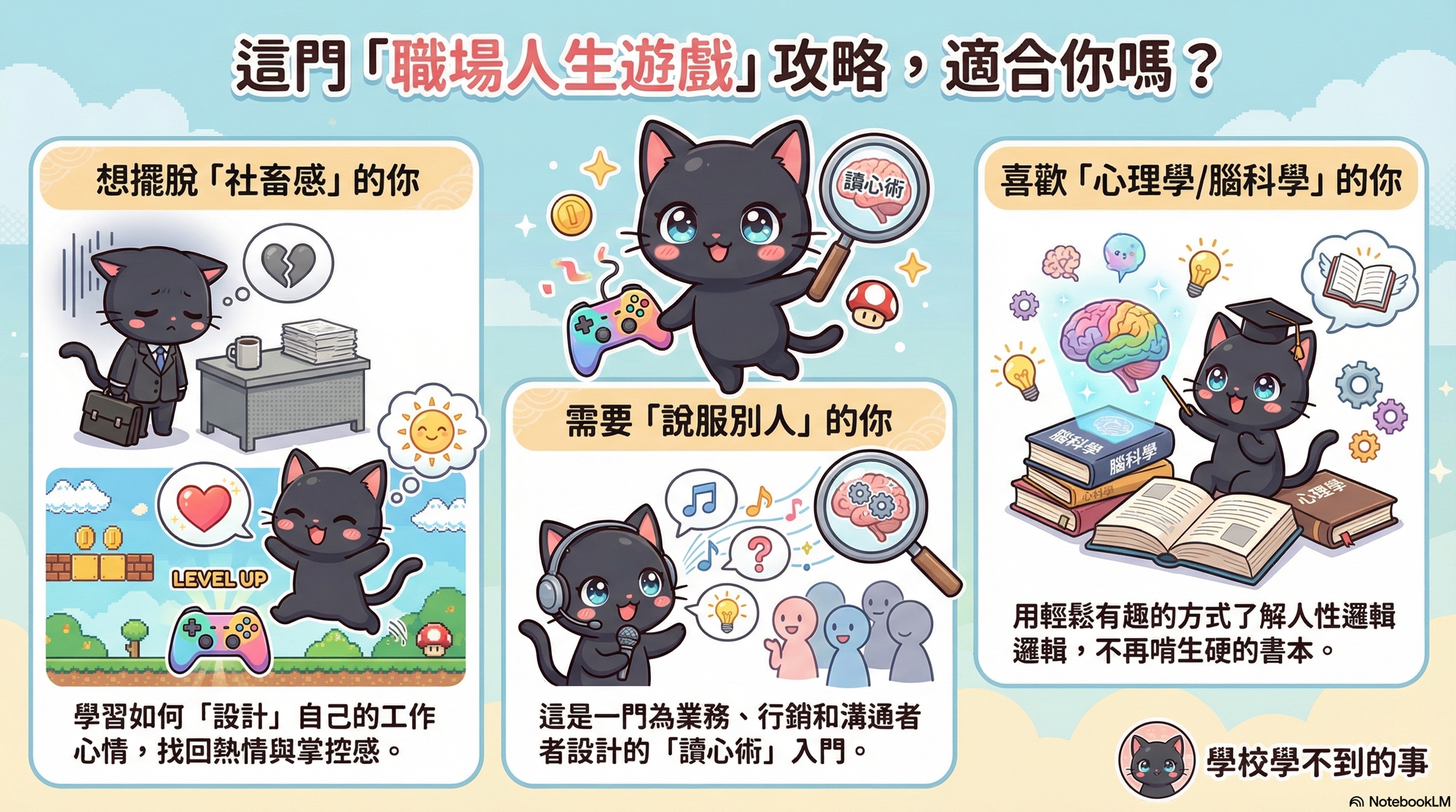 - 需要「說服別人」的人: 業務、行銷、或是常常需要跨部門溝通的窗口。 (這門課是你最好的「讀心術」入門)