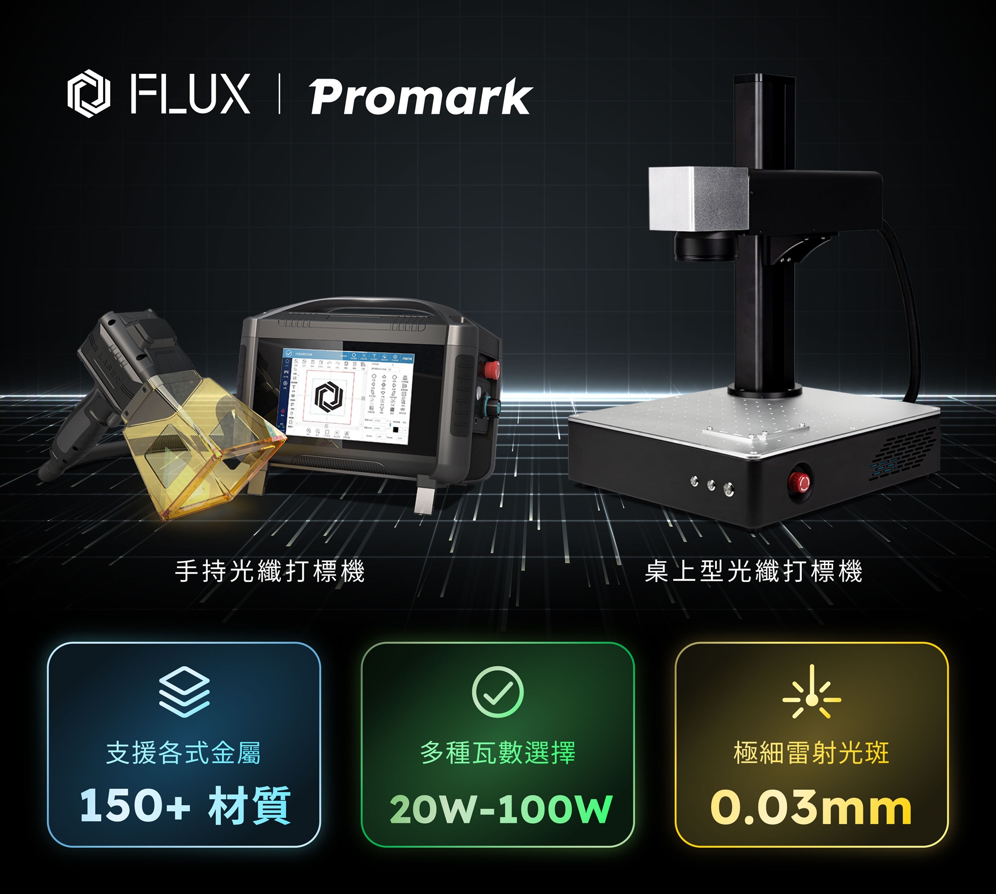 FLUX 推出第二代 Promark 光纖打標機以及手持式光纖打標機,完美適用於各式金屬,同時支援黑色壓克力、塑膠、石材。多種瓦數選擇,搭載 10000mm/s 超高速雕刻,提供創作者隨時隨地、隨心所欲雷射打標體驗。